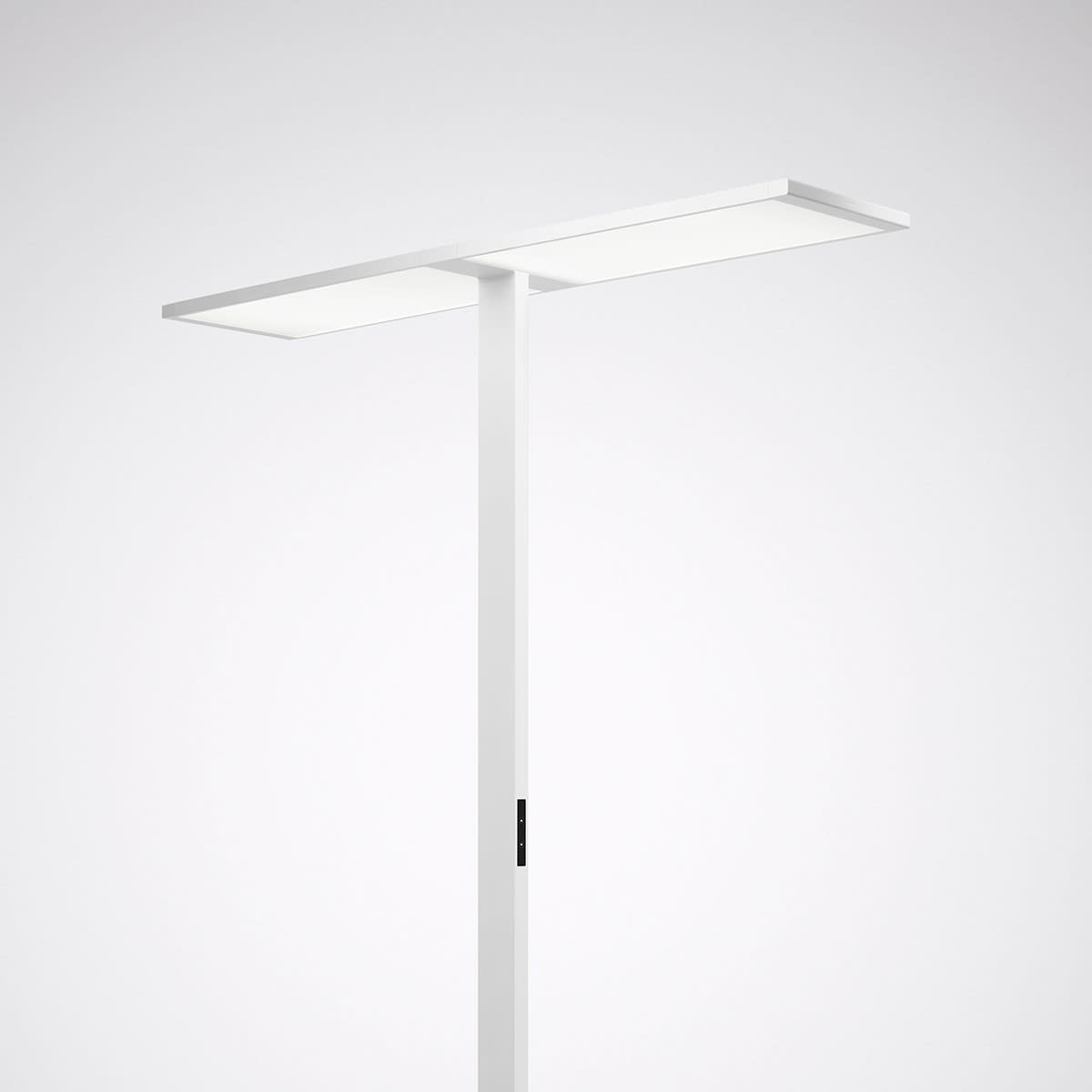 Luminaire sur pied LED exclusif, disposant de 2 têtes de luminaire, commandables séparément, à répartition directe/indirecte. Convenant à un éclairage conforme aux normes, de postes de travail doubles ou quadruples. Tête de luminaire prémontée permettant un montage simple et rapide en seulement trois étapes. Grâce à sa répartition extensive des intensités lumineuses, légèrement asymétrique, la composante directe du luminaire a pour effet un éclairage très uniforme de la surface du bureau. La composante indirecte à répartition de la lumière lambertienne a pour effet un éclairage intérieur optimal. À répartition symétrique limitée et extensive des intensités lumineuses. Taux d'éblouissement selon classification UGR (EN 12464-1) < 19. Compatible avec les postes de travail informatisés selon la norme EN 124641 Flux lumineux du luminaire et couleur de la lumière fixes. Flux lumineux du luminaire 29000 lm, puissance raccordée 180 W, rendement lumineux maximale du luminaire 161 lm/W. Teinte de lumière blanc chaud, température de couleur (CCT) 3000 K, indice général de rendu des couleurs (IRC) Ra > 80. Tolérance de localisation chromatique (initialement MacAdam) ≤ 3 SDCM. Durée de vie assignée moyenne L80 (tq 25 °C) = 100.000 h. La source lumineuse est remplaçable conformément aux exigences d'écoconception (Règlement (UE) 2019/2020). Corps de luminaire en profilé d’aluminium extrudé et en aluminium moulé sous pression. Pied du luminaire en forme de H. Surface à revêtement blanc (similaire à RAL 9016). Autres couleurs disponibles sur demande. Hauteur du luminaire: 2000 mm, Longueur/largeur du pied support: 800 mm / 450 mm, Longueur/largeur de la tête de luminaire: 1334 mm x 290 mm, Hauteur de la tête du luminaire: 23 mm. Dimensions du tube de support: 80 mm x 30 mm. Classe électrique (EN 61140) : I, indice de protection (norme EN 60529) : IP20, degré de résistance aux chocs selon la norme CEI 62262 : IK02, température d’essai au fil incandescent selon la norme CEI 60695-2-11 : 650 °C. Température ambiante admissible (ta): 25 °C Poids: 25.2 kg. Raccordement au moyen d’un câble d’alimentation flexible 3 x 1 mm2 (fiche avec contact de protection et prise avec terre C14), longueur env. 3 000 mm. Fiche avec contact de protection compatible avec des prises de courant de type E et de type F. Modèle de connecteur : Coudé. Types alternatifs de connecteurs disponibles : Fiche de raccordement de type J SEV, Suisse, Fiche de raccordement type BS, British Standard 1363. Avec câble d’alimentation. Avec 2 appareillages électronique, dimmables (DALI). Appareillage conf. au standard DALI 2 (EN 62386). L'appareillage est remplaçable conformément aux exigences d'écoconception (Règlement (UE) 2019/2020). Les éléments de commande (commutateur à deux voies) de chaque tête de luminaire sont intégrés au tube de support Il est ainsi possible d’effectuer séparément la gradation et commutation pour chaque tête de luminaire. Le luminaire est en outre certifié ENEC par un organisme de contrôle indépendant.