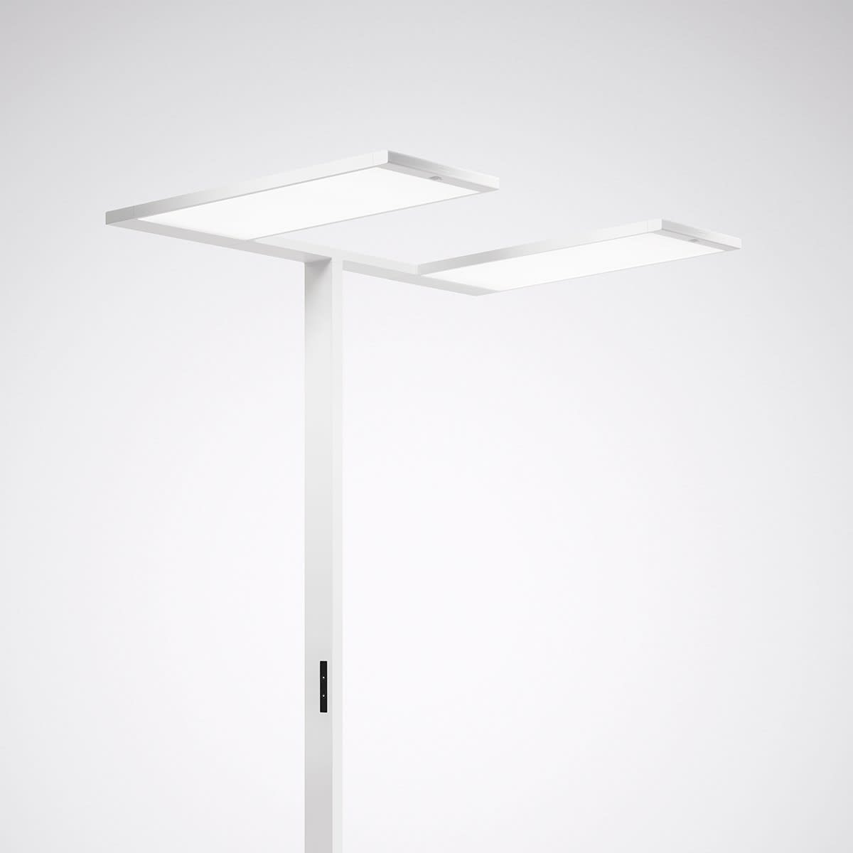 Luminaire sur pied LED exclusif, disposant de 2 têtes de luminaire, commandables séparément, à répartition directe/indirecte. Convenant à un éclairage conforme aux normes, de doubles postes de travail en vis-à-vis, notamment si ces derniers sont dotés de cloisons de séparation les isolant. Détecteur de présence, infrarouge passif et un capteur de lumière du jour, tous deux intégrés. Grâce à sa répartition extensive des intensités lumineuses, légèrement asymétrique, la composante directe du luminaire a pour effet un éclairage très uniforme de la surface du bureau. La composante indirecte à répartition de la lumière lambertienne a pour effet un éclairage intérieur optimal. À répartition symétrique limitée et extensive des intensités lumineuses. Taux d'éblouissement selon classification UGR (EN 12464-1) < 19. Compatible avec les postes de travail informatisés selon la norme EN 124641 Flux lumineux du luminaire et couleur de la lumière fixes. Flux lumineux du luminaire 30600 lm, puissance raccordée 180 W, rendement lumineux maximale du luminaire 170 lm/W. Teinte de lumière blanc neutre, température de couleur (CCT) 4000 K, indice général de rendu des couleurs (IRC) Ra > 80. Tolérance de localisation chromatique (initialement MacAdam) ≤ 3 SDCM. Durée de vie assignée moyenne L80 (tq 25 °C) = 100.000 h. La source lumineuse est remplaçable conformément aux exigences d'écoconception (Règlement (UE) 2019/2020). Corps de luminaire en profilé d’aluminium extrudé et en aluminium moulé sous pression. Pied du luminaire en U. Surface à revêtement blanc (similaire à RAL 9016). Autres couleurs disponibles sur demande. Hauteur du luminaire: 2000 mm, Longueur/largeur du pied support: 550 mm / 550 mm, Longueur/largeur de la tête de luminaire: 1080 mm x 710 mm, Hauteur de la tête du luminaire: 23 mm. Dimensions du tube de support: 80 mm x 80 mm. Classe électrique (EN 61140) : I, indice de protection (norme EN 60529) : IP20, degré de résistance aux chocs selon la norme CEI 62262 : IK02, température d’essai au fil incandescent selon la norme CEI 60695-2-11 : 650 °C. Température ambiante admissible (ta): 25 °C Poids: 25.2 kg. Raccordement au moyen d’un câble d’alimentation flexible 3 x 1 mm2 (fiche avec contact de protection et prise avec terre C14), longueur env. 3 000 mm. Fiche avec contact de protection compatible avec des prises de courant de type E et de type F. Modèle de connecteur : Coudé. Types alternatifs de connecteurs disponibles : Fiche de raccordement de type J SEV, Suisse, Fiche de raccordement type BS, British Standard 1363. Avec câble d’alimentation. Avec 2 appareillages électronique, dimmables (DALI). Appareillage conf. au standard DALI 2 (EN 62386). Possibilité de commutation et de gradation du luminaire au moyen de la fonction bouton-poussoir via les bornes de commande DALI (TouchDim). L'appareillage est remplaçable conformément aux exigences d'écoconception (Règlement (UE) 2019/2020). Le commutateur à deux support permet une commutation/gradation séparée des composantes directe et indirecte.