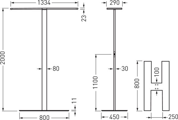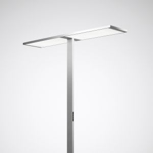 Luminaire sur pied LED exclusif, disposant de 2 têtes de luminaire, commandables séparément, à répartition directe/indirecte. Convenant à un éclairage conforme aux normes, de postes de travail doubles ou quadruples. Avec équipement Smart-Connect. Le luminaire dispose d’un capteur de lumière du jour/détecteur de présence HF intégré avec détection de la direction du mouvement. Tête de luminaire prémontée permettant un montage simple et rapide en seulement trois étapes. Grâce à sa répartition extensive des intensités lumineuses, légèrement asymétrique, la composante directe du luminaire a pour effet un éclairage très uniforme de la surface du bureau. La composante indirecte à répartition de la lumière lambertienne a pour effet un éclairage intérieur optimal. À répartition symétrique limitée et extensive des intensités lumineuses. Taux d'éblouissement selon classification UGR (EN 12464-1) < 19. Compatible avec les postes de travail informatisés selon la norme EN 124641 Flux lumineux du luminaire et couleur de la lumière fixes. Flux lumineux du luminaire 30600 lm, puissance raccordée 216 W, rendement lumineux maximale du luminaire 142 lm/W. Teinte de lumière blanc neutre, température de couleur (CCT) 4000 K, indice général de rendu des couleurs (IRC) Ra > 80. Tolérance de localisation chromatique (initialement MacAdam) ≤ 3 SDCM. Durée de vie assignée moyenne L80 (tq 25 °C) = 100.000 h. La source lumineuse est remplaçable conformément aux exigences d'écoconception (Règlement (UE) 2019/2020). Corps de luminaire en profilé d’aluminium extrudé et en aluminium moulé sous pression. Pied du luminaire en forme de H. Surface à revêtement gris argent (similaire à RAL 9006). Autres couleurs disponibles sur demande. Hauteur du luminaire: 2000 mm, Longueur/largeur du pied support: 800 mm / 450 mm, Longueur/largeur de la tête de luminaire: 1334 mm x 290 mm, Hauteur de la tête du luminaire: 23 mm. Dimensions du tube de support: 80 mm x 30 mm. Classe électrique (EN 61140) : I, indice de protection (norme EN 60529) : IP20, degré de résistance aux chocs selon la norme CEI 62262 : IK02, température d’essai au fil incandescent selon la norme CEI 60695-2-11 : 650 °C. Température ambiante admissible (ta): 25 °C Poids: 25.2 kg. Raccordement au moyen d’un câble d’alimentation flexible 3 x 1 mm2 (fiche avec contact de protection et prise avec terre C14), longueur env. 3 000 mm. Fiche avec contact de protection compatible avec des prises de courant de type E et de type F. Modèle de connecteur : Coudé. Types alternatifs de connecteurs disponibles : Fiche de raccordement de type J SEV, Suisse, Fiche de raccordement type BS, British Standard 1363. Avec câble d’alimentation. Avec 2 appareillages électronique, dimmables (DALI). L'appareillage est remplaçable conformément aux exigences d'écoconception (Règlement (UE) 2019/2020). Les éléments de commande (commutateur à deux voies) de chaque tête de luminaire sont intégrés au tube de support Il est ainsi possible d’effectuer séparément la gradation et commutation pour chaque tête de luminaire. Le luminaire est en outre certifié ENEC par un organisme de contrôle indépendant.