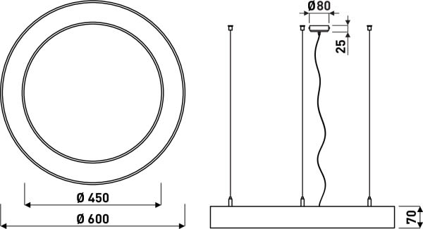 Luminaire suspendu à effet aérien pour un éclairage de base homogène. Version ronde. Le système optique est composé d'un diffuseur opale avec une répartition lumineuse lambertienne.. Avec une répartition lambertienne des intensités lumineuses. Flux lumineux du luminaire et couleur de la lumière fixes. Flux lumineux du système 5555 lm, Puissance du système 51 W, Teinte de lumière blanc chaud, température de couleur (CCT) 3000 K, indice général de rendu des couleurs (IRC) Ra > 80. Durée de vie assignée moyenne L80 (tq 25 °C) = 50.000 h. Corps de luminaire en profilé d’aluminium extrudé, Dimensions (L x l x H) : 600 mm x 600 mm x 70 mm. Classe électrique (EN 61140) : 01 I, indice de protection (norme EN 60529) : IP20. Température ambiante admissible (ta): 25 °C Poids: 5.6 kg. Luminaire pour montage rapide avec système de connecteur rapide Wieland. La tension de service nominale du luminaire est de : 230 V, 50/60 Hz. Avec appareillage électronique, commutable. Le produit répond aux exigences essentielles des directives européennes applicables et de la loi sur la sécurité des produits et porte le marquage CE.