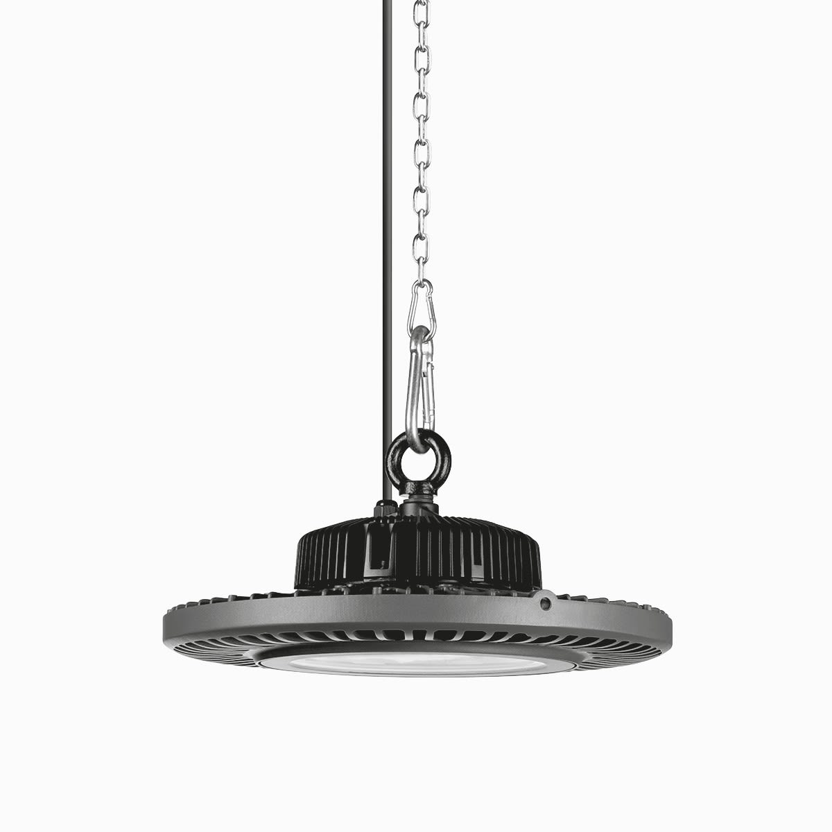 Armature industrielle LED pour montage suspendu. Convient pour une utilisation dans les entreprises certifiées HACCP, IFS et/ou BRC Global Standard Food (DIN 10500). Avec température de surface limitée, convient pour une utilisation dans des locaux à risque d'incendie selon DIN EN 60598-2-24. Pour montage suspendu individuel. Suspension à un point sur crochet à visser, intégré au centre. Accessoires de montage à commander séparément. Système optique avec optique à lentilles PC. Avec une unité optique par module LED. À répartition intensive-extensive symétrique en rotation des intensités lumineuses. Flux lumineux du luminaire 10600 lm, puissance raccordée 95,00 W, rendement lumineux du luminaire 111 lm/W. Teinte de lumière blanc neutre, température de couleur (CCT) 4000 K, indice général de rendu des couleurs (IRC) Ra > 80. Durée de vie assignée moyenne L80(tq 25 °C) = 50.000 h, Durée de vie assignée moyenne L70(tq 25 °C) = 60.000 h. La source lumineuse est remplaçable conformément aux exigences d'écoconception (Règlement (UE) 2019/2020). Boîtier robuste en Aluminium moulé sous pression avec ailettes de refroidissement intégrées. Surface au revêtement gris argent . Diamètre du luminaire 388 mm, Hauteur du luminaire 175 mm. Température ambiante admissible (ta): -25 °C - +35 °C. Classe électrique (EN 61140) : I, indice de protection (norme EN 60529) : IP65, degré de résistance aux chocs selon la norme CEI 62262 : IK08, température d’essai au fil incandescent selon la norme CEI 60695-2-11 : 650 °C. Poids: 6,8 kg. Le raccordement secteur s'effectue au moyen d'un câble d'alimentation à 3 pôles. Avec driver. Le produit répond aux exigences essentielles des directives européennes applicables et de la loi sur la sécurité des produits et porte le marquage CE. Le luminaire est en outre certifié ENEC par un organisme de contrôle indépendant.