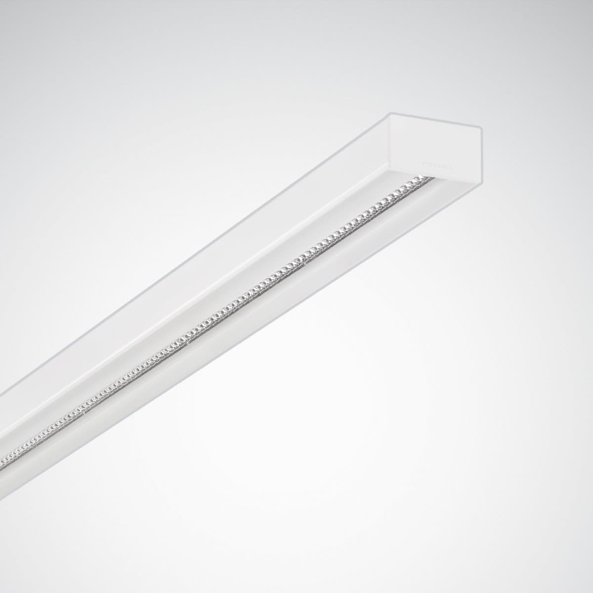 Plafonnier à LED pour applications individuelles ou applications en ligne continue. Convient également au montage en suspension avec des accessoires à commander séparément (ZS1P 2000). Système optique en Micro Reflector Technology (MRW) avec compartiments du réflecteur, très efficaces (vaporisation d’aluminium) en plastique pour un anti-éblouissement et une efficacité élevés. Découplage discret de la lumière, latéral sur toute la longueur du luminaire. À répartition symétrique limitée et extensive des intensités lumineuses. Taux d'éblouissement selon classification UGR (EN 12464-1) < 19. Compatible avec les écrans informatiques selon la norme EN 12464-1 grâce à des luminosités réduites L ≤ 1 500 cd/m2 pour angle d’éclairage supérieur à 65 °, de manière omnidirectionnelle. Flux lumineux du luminaire et couleur de la lumière fixes. Système LED et optique du luminaire sous forme de module à engager sans outil dans le corps du luminaire. Module avec câble en acier l’empêchant de tomber lors du montage. Flux lumineux du luminaire 3800 lm, puissance raccordée 28 W, rendement lumineux maximale du luminaire 136 lm/W. Teinte de lumière blanc chaud, température de couleur (CCT) 3000 K, indice général de rendu des couleurs (IRC) Ra > 80. Tolérance de localisation chromatique (initialement MacAdam) ≤ 3 SDCM. Durée de vie assignée moyenne L80(tq 25 °C) = 50.000 h. La source lumineuse est remplaçable conformément aux exigences d'écoconception (Règlement (UE) 2019/2020). Corps de luminaire en tôle d’acier. Surface revêtue de blanc (RAL 9016). Dimensions (L x l): 1413 mm x 84 mm, hauteur du luminaire 45 mm. Température ambiante admissible (ta): -20 °C - +. Classe électrique (EN 61140) : I, indice de protection (norme EN 60529) : IP20, degré de résistance aux chocs selon la norme CEI 62262 : IK03, température d’essai au fil incandescent selon la norme CEI 60695-2-11 : 650 °C. Poids: 4.0 kg. Le raccordement côté réseau s’effectue au moyen de bornes à fiche. Le raccordement électrique des modules se fait automatiquement. Avec appareillage électronique, commutable. L'appareillage est remplaçable conformément aux exigences d'écoconception (Règlement (UE) 2019/2020). Le produit répond aux exigences essentielles des directives européennes applicables et de la loi sur la sécurité des produits et porte le marquage CE. Le luminaire est en outre certifié ENEC par un organisme de contrôle indépendant.