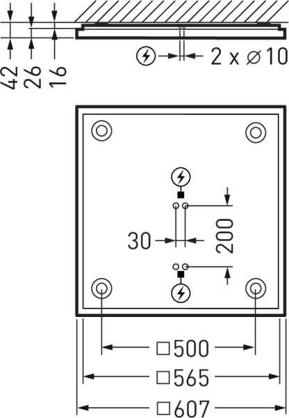 Plafonnier LED carré, à diffuseur microprismatique PW19. Le système optique se compose d’une vasque en PMMA très efficace à microprismatique. La surface prismatique en PMMA, microstructurée du système optique a un effet anti-éblouissement, elle est anti-jaunissement et anti-opacité. À répartition symétrique limitée et extensive des intensités lumineuses. Taux d'éblouissement selon classification UGR (EN 12464-1) < 19. Compatible avec les écrans informatiques selon la norme EN 12464-1 grâce à des luminosités réduites L ≤ 3 000 cd/2 pour des angles d’éclairage supérieurs à 65 °, de manière omnidirectionnelle.. Effet lumineux harmonieux grâce à une sortie de lumière uniformément éclairée. Personnalisation de la surface de sortie de lumière (notamment par impression) et autres solutions spéciales, possibles sur demande. Flux lumineux du luminaire et couleur de la lumière fixes. Flux lumineux du luminaire 4200 lm, puissance raccordée 26 W, rendement lumineux maximale du luminaire 162 lm/W. Teinte de lumière blanc chaud, température de couleur (CCT) 3000 K, indice général de rendu des couleurs (IRC) Ra > 80. Tolérance de localisation chromatique (initialement MacAdam) ≤ 3 SDCM. Durée de vie assignée moyenne L80 (tq 25 °C) = 100.000 h., Durée de vie assignée moyenne L90 (tq 25 °C) = 50.000 h. La source lumineuse est remplaçable conformément aux exigences d'écoconception (Règlement (UE) 2019/2020). Le plafonnier se compose d’un corps de montage à unité d’éclairage, d’un connecteur rapide et de l’appareillage ainsi que d’une unité d’éclairage en applique comportant système LED, diffuseur, connecteur rapide et cadre. Surface à revêtement blanc (similaire à RAL 9016). Dimensions (L x l): 607 mm x 607 mm, hauteur 42 mm. Classe électrique (EN 61140) : I, indice de protection (norme EN 60529) : IP40, degré de résistance aux chocs selon la norme CEI 62262 : IK03, température d’essai au fil incandescent selon la norme CEI 60695-2-11 : 650 °C. Température ambiante admissible (ta): 25 °C . Poids: 7.4 kg. Avec driver, dimmable (DALI). Appareillage conf. au standard DALI 2 (EN 62386). Possibilité de commutation et de gradation du luminaire au moyen de la fonction bouton-poussoir via les bornes de commande DALI (TouchDim). L'appareillage est remplaçable conformément aux exigences d'écoconception (Règlement (UE) 2019/2020). Appareillage protégé contre le mode à vide, les raccordements incorrects, les courts-circuits, surcharges et surtempératures. La certification ENEC par un laboratoire d'essais indépendant est en préparation. Ce luminaire qui est prêt au monitoring (MOR) fournit des données d’exploitation permettant une surveillance ou une maintenance prédictive, il est donc compatible avec les services de TRILUX Monitoring Services. Le produit répond aux exigences essentielles des directives européennes applicables et de la loi sur la sécurité des produits et porte le marquage CE.