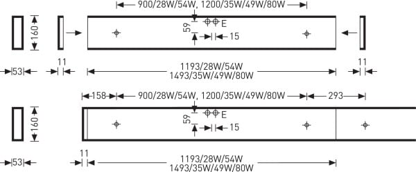 Plafonnier pour des applications individuelles et en ligne continue Pour 1 lampe fluorescente T16 35/49/80 Watt. À optique de faible section, grand brillant. Avec surface argent à pouvoir réflecteur renforcé, degré de réflexion > 98 %. Degré de réflexion 98 %, pourcentage de réflexions dispersées < 3 %. Compatible avec les écrans informatiques selon la norme EN 12464-1 grâce à des luminosités réduites L ≤ 1 500 cd/m2 pour angle d’éclairage supérieur à 65 °, de manière omnidirectionnelle. Fixation de l’optique et mise à la terre automatique grâce aux fermetures à contact frotteur. Optique rabattable et décrochable des deux côtés sans outil. rendement lumineux maximale du luminaire lm/W. Corps de luminaire en tôle d’acier. Surface au revêtement blanc Dimensions (L x l) 1493 mm x 160 mm, hauteur du luminaire 53 mm. Dimensions de montage pour embouts frontaux : 11 mm par embout frontal pour application en luminaires d’extrémité ou en luminaires individuels. Veuillez commander séparément les embouts frontaux pour les luminaires individuels ou les extrémités de lignes continues. Design rectangulaire avec bord de 40 mm de largeur sur le côté longitudinal. Corps de luminaire à baguettes d'accouplement intégrées pour lignes continues à alignement précis avec optiques continues. Température ambiante admissible (ta): -20 °C - +. Classe électrique (EN 61140) : I, indice de protection (norme EN 60529) : IP20, degré de résistance aux chocs selon la norme CEI 62262 : IK02, température d’essai au fil incandescent selon la norme CEI 60695-2-11 : 650 °C. Avec ballast électronique, dimmable (DALI).