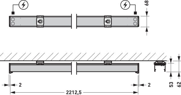 Profil-support pour les applications en ligne continue de la ligne 78... E-Line Pro avec accouplement et connecteur. Avec filerie d’alimentation continu à 7 conducteurs pour un raccordement rapide et sans outil des platines-appareillages librement positionnables, Section de conducteur 7 x 2,5 mm2, sans halogène. La gestion de la dilatation thermique du système de conduction du courant se fait par des fixations ponctuelles du conducteur et du segment porteur. Convient pour une utilisation dans des environnements nécessitant un indice de protection allant jusqu'à IP64 (IP20/IP50/IP64). L'indice de protection de la ligne continue est déterminé par les platines-appareillages et les accessoires. Si l'indice IP5x est atteint en combinaison avec la platine-appareillage et les accessoires, le luminaire convient à une utilisation dans des sites de production à risque d'incendie selon la norme DIN EN 60598-2-24 (identifiant D).. Le corps du profil-support est en tôle d'acier profilée et galvanisée à chaud.. Revêtu d'un vernis de protection à l'intérieur, d'un vernis polyester à l'extérieur, couleur blanc (similaire à RAL 9016). Longueur du profil-support: 2212 mm. Pour une application en ligne continue, l’entraxe de fixation peut atteindre 4 000 mm.
