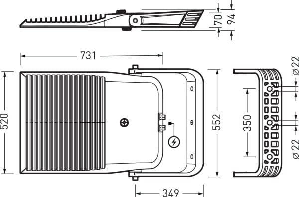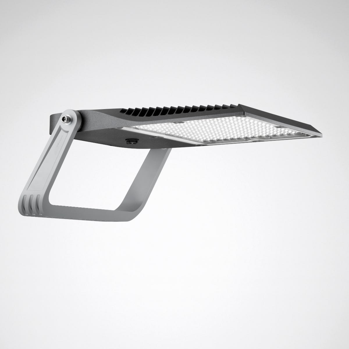 Projecteur LED pour illumination de surfaces. Le luminaire satisfait aux exigences de la norme EN 60598, il a été conçu pour des actions du vent selon la norme EN 1991 (Eurocode), la valeur de base maximale de la vitesse de référence du vent étant de 30 m/s (correspondant à la zone de vent 4 en Allemagne) dans la catégorie de terrain I. Tête de projecteur pivotant sur l'étrier de montage grâce au montage à 1 point. Blocage de la position de pivotement par des arrêts dentés. La tête du projecteur et l'étrier de montage sont entièrement montés à la livraison. En version MLT (Technologie Multi Lens), composé de systèmes de lentilles hautement efficaces, résistants aux UV et aux températures extrêmes, en montage quadruple. À répartition semi-extensive asymétrique des intensités lumineuses. D’autres faisceaux sont disponibles pour une adaptation flexible à des tâches d’éclairage personnalisées client. Flux lumineux du luminaire et couleur de lumière fixes, avec maintien du flux lumineux en fin de vie (CLO). Système LED composé de 36 modules LED MLT avec 4 LED chacun. Flux lumineux du luminaire 42000 lm, puissance raccordée 261 W, rendement lumineux maximale du luminaire 161 lm/W. Teinte de lumière blanc neutre, température de couleur (CCT) 4000 K, indice général de rendu des couleurs (IRC) Ra > 70. Tolérance de localisation chromatique (initialement MacAdam) ≤ 5 SDCM. Durée de vie assignée moyenne LCLO(tq 25 °C) = 100.000 h. La source lumineuse est remplaçable conformément aux exigences d'écoconception (Règlement (UE) 2019/2020). Corps du luminaire et support de la vitre de fermeture en aluminium moulé sous pression. Verre de fermeture en verre de sécurité simple plan, maintenu dans un cadre support. Corps du luminaire (couleur primaire) et étrier de retenue (couleur supplémentaire) de couleur contrastée. Couleur primaire anthracite (DB 703), couleur supplémentaire gris argenté (RAL 9006). Boîtier de luminaire très résistant aux intempéries, revêtement poudré. Possibilité d’autres variantes de couleur selon RAL ou code couleur DB. Dimensions (L x l): 808 mm x 590 mm, hauteur 320 mm. Résistant aux chocs des balles selon DIN 18032-3. Classe électrique (EN 61140) : I, indice de protection (norme EN 60529) : IP66, degré de résistance aux chocs selon la norme CEI 62262 : IK09. Surface exposée au vent Fw . Poids: 23.0 kg. Le luminaire convient à un fonctionnement sur un réseau à tension continue 230 V. Avec driver, dimmable (DALI). Appareillage conf. au standard DALI 2 (EN 62386). L'appareillage est remplaçable conformément aux exigences d'écoconception (Règlement (UE) 2019/2020). Résistance aux pics de tension Mode différentiel / mode commun : 6 kV / 10 kV. Le produit répond aux exigences essentielles des directives européennes applicables et de la loi sur la sécurité des produits et porte le marquage CE.