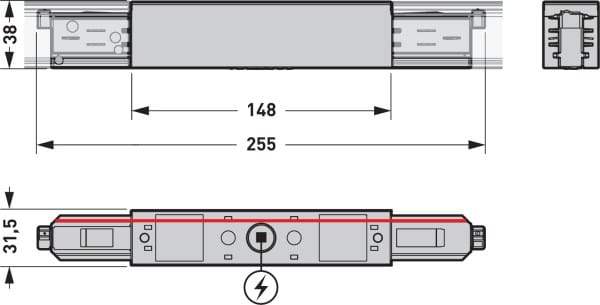 Connecteur en I pour la connexion mécanique et électrique de deux segments de rail conducteur triphasé avec équipement DALI. Avec possibilité d’alimentation. Avec dispositif d’alimentation pour l’alimentation centrale. À utiliser en combinaison avec système de rails conducteurs triphasé (DALI) - Rail.. Convient aux rails conducteurs encastrés et en saillie. Couleur blanc (similaire à RAL 9016). Dimensions (L x l x H) : 255 mm x 38 mm x 32 mm. Position de la polarité, voir le marquage rouge sur le schéma coté.