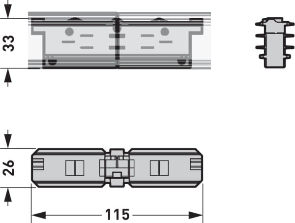 Accouplement non conducteur sans dispositif d’alimentation pour une connexion mécanique intégrée. À utiliser en combinaison avec système de rails conducteurs triphasé (DALI) - Rail.. Couleur noir (similaire à RAL 9005). Dimensions (L x l x H) : 115 mm x 32 mm x 26 mm. Position de la polarité, voir le marquage rouge sur le schéma coté.