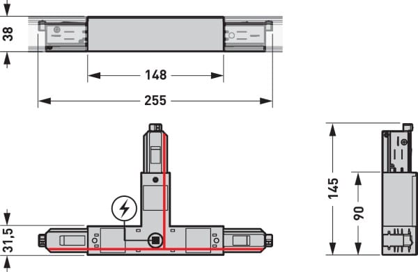 Connecteur en T pour trois segments de rail conducteur triphasés avec équipement DALI. Avec possibilité d’alimentation. Convient aux rails conducteurs encastrés et en saillie. À utiliser en combinaison avec système de rails conducteurs triphasé (DALI) - Rail.. Couleur noir (similaire à RAL 9005). Dimensions (L x l x H) : 255 mm x 145 mm x 38 mm. Position de la polarité, voir le marquage rouge sur le schéma coté.