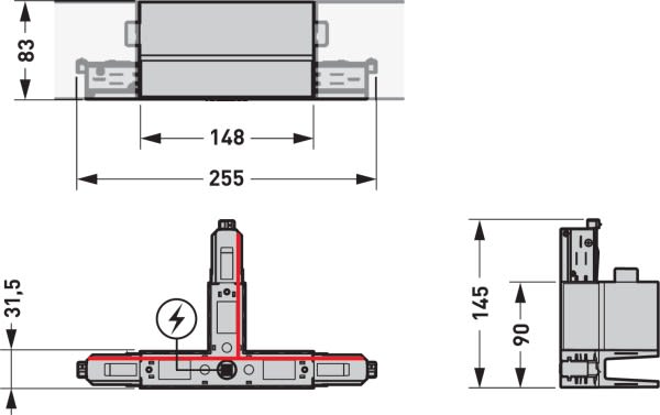Connecteur en T pour trois segments de rail conducteur triphasés avec équipement DALI. Avec possibilité d’alimentation. Convient aux rails conducteurs suspendus. À utiliser en combinaison avec système de rails conducteurs triphasé (DALI) - Rail.. Couleur noir (similaire à RAL 9005). Dimensions (L x l x H) : 255 mm x 145 mm x 84 mm. Position de la polarité, voir le marquage rouge sur le schéma coté.