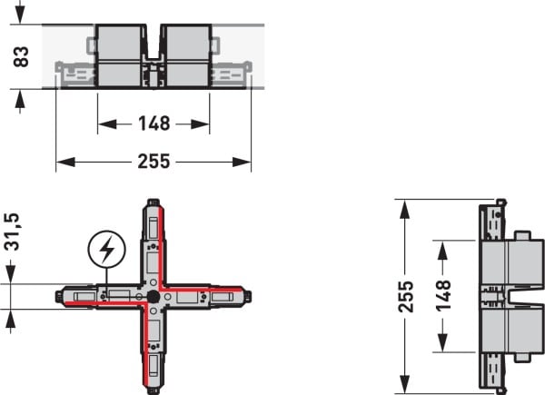 Connecteur en X pour quatre segments de rail conducteur triphasés avec équipement DALI. Avec possibilité d’alimentation. Convient aux rails conducteurs suspendus. À utiliser en combinaison avec système de rails conducteurs triphasé (DALI) - Rail.. Position de la polarité, voir le marquage rouge sur le schéma coté. Couleur noir (similaire à RAL 9005). Dimensions (L x l x H) : 255 mm x 255 mm x 84 mm. Position de la polarité, voir le marquage rouge sur le schéma coté.