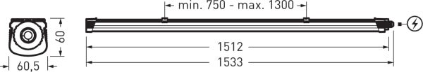 Plafonnier pour locaux humides et extérieurs sous abri. Avec température de surface limitée (DIN EN 60598-2-24, identifiant D). Clips de montage et étriers triangulaires pour montage suspendu, inclus dans la livraison. Avec recouvrement en PC translucide. Avec une répartition lambertienne des intensités lumineuses. Flux lumineux du luminaire et couleur de la lumière réglable sur 4 niveaux (Multilumen, Multicolour). Flux lumineux du luminaire 3800 lm - 5600 lm, puissance raccordée 33,00 W - 48,00 W, Teinte de lumière blanc neutre ou blanc lumière du jour, température de couleur (CCT) 4 000 K ou 6500 K, indice général de rendu des couleurs (IRC) Ra > 80. Tolérance de localisation chromatique (initialement MacAdam) ≤ 5 SDCM. Durée de vie assignée moyenne L70 (tq 25 °C) = 50.000 h. Partie supérieure du profilé en polycarbonate extrudé. Embouts frontaux en PC, avec protection UV. Partie inférieure du profilé en polycarbonate opale, extrudé. Dimensions (L x l): 1533 mm x 60.5 mm, hauteur du luminaire 60 mm. Classe électrique (EN 61140) : II, indice de protection (norme EN 60529) : IP65, degré de résistance aux chocs selon la norme CEI 62262 : IK08, température d’essai au fil incandescent selon la norme CEI 60695-2-11 : . Température ambiante admissible (ta): 35 °C Poids: 1.4 kg. Entrée des câbles doté d’une fermeture à baïonnette afin d’étanchéifier le compartiment de raccordement. Le branchement du luminaire s’effectue au moyen d’une borne à fiche. Avec appareillage électronique, commutable. Le produit répond aux exigences essentielles des directives européennes applicables et de la loi sur la sécurité des produits et porte le marquage CE. Le luminaire est en outre certifié ENEC par un organisme de contrôle indépendant.