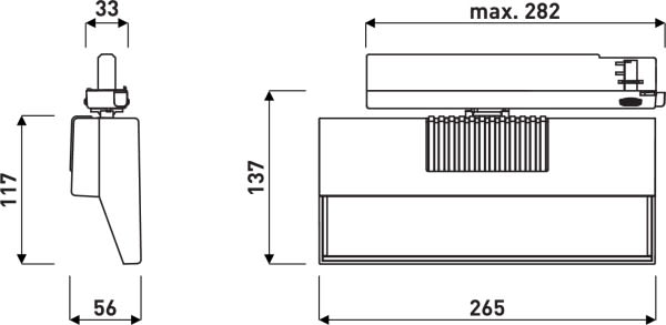 Wallwasher pour le rail conducteur pour un éclairage particulièrement homogène et clair des murs, des graphiques et des illustrations. Module projecteur pivotant sur +/- 10 ° et orientable sur 355 °. Avec optique asymétrique. Wallwasher à répartition asymétrique des intensités lumineuses. Flux lumineux du luminaire et couleur de la lumière fixes. Flux lumineux du système 3825 lm, puissance raccordée 26 W, Teinte de lumière blanc neutre, température de couleur (CCT) 4000 K, indice général de rendu des couleurs (IRC) Ra > 80. Durée de vie assignée moyenne L80 (tq 25 °C) = 50.000 h. Corps de luminaire en aluminium moulé sous pression. Surface à laquage par poudre, structuré. Couleur blanc, Dimensions (L x l x H) : 265 mm x 56 mm x 136.5 mm. Classe électrique (EN 61140) : II, indice de protection (norme EN 60529) : IP20. Température ambiante admissible (ta): 25 °C Poids: 1.0 kg. La tension de service nominale du luminaire est de : 230 V, 50/60 Hz. Avec appareillage électronique, commutable. Le driver est intégré à l’adaptateur du rail conducteur. Le produit répond aux exigences essentielles des directives européennes applicables et de la loi sur la sécurité des produits et porte le marquage CE.
