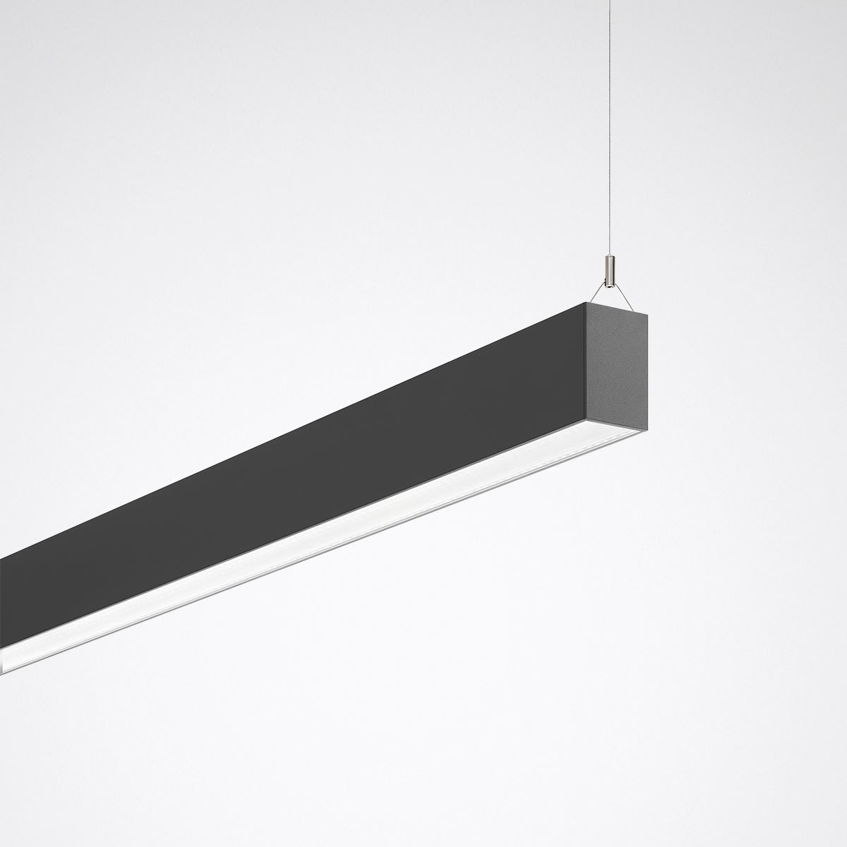 Luminaire individuel du système de canaux lumineux en luminaire suspendu pour une mise en scène architecturale de l’éclairage. Ce luminaire fait partie d’une gamme de luminaires encastrés, de plafonniers et de luminaires suspendus, dont l’aspect est harmonisé. Tous les accessoires indispensables au système (baldaquin de plafond, câble d’alimentation, suspensions par câble, en Y et embouts frontaux) sont inclus dans la livraison. Sortie de lumière de type direct, dotée d’un recouvrement à prismes en PMMA, monté en affleurement et très efficace. Sortie de lumière de type indirect, dotée d’un diffuseur en PMMA opale monté en affleurement, à éclairage homogène. À répartition symétrique limitée et extensive des intensités lumineuses. Taux d'éblouissement selon classification UGR (EN 12464-1) < 19. Compatible avec les postes de travail informatisés selon la norme EN 124641 Flux lumineux du luminaire 8569 lm, puissance raccordée 75 W, rendement lumineux maximale du luminaire 114 lm/W. Teinte de lumière blanc chaud, température de couleur (CCT) 3000 K, indice général de rendu des couleurs (IRC) Ra > 80. Tolérance de localisation chromatique (initialement MacAdam) ≤ 3 SDCM. Durée de vie assignée moyenne L90 (tq 25 °C) = 50.000 h., Durée de vie assignée moyenne L80 (tq 25 °C) = 100.000 h. La source lumineuse est remplaçable conformément aux exigences d'écoconception (Règlement (UE) 2019/2020). Éléments de canal en profilé extrudé d’aluminium, embouts frontaux en plastique (PMMA). Surface à revêtement noir (similaire à RAL 9005). Dimensions (L x l): 1546 mm x 50 mm, hauteur du luminaire 75 mm. Classe électrique (EN 61140) : I, indice de protection (norme EN 60529) : IP20, degré de résistance aux chocs selon la norme CEI 62262 : IK03, température d’essai au fil incandescent selon la norme CEI 60695-2-11 : 650 °C. Température ambiante admissible (ta): 25 °C . Poids: 6.3 kg. Le raccordement au réseau s'effectue au moyen d'une borne à 5 pôles jusqu'à 1,5 mm2. Avec driver, dimmable (DALI). L'appareillage est remplaçable conformément aux exigences d'écoconception (Règlement (UE) 2019/2020). Le produit répond aux exigences essentielles des directives européennes applicables et de la loi sur la sécurité des produits et porte le marquage CE.