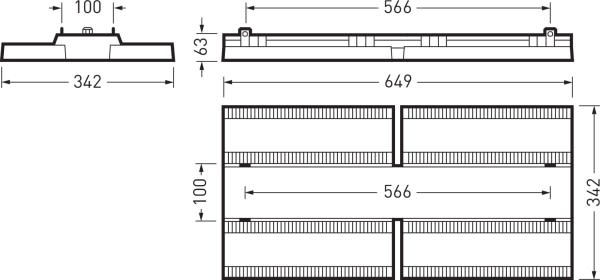 Projecteur LED de hall robuste. Convient pour une utilisation dans les entreprises certifiées HACCP, IFS et/ou BRC Global Standard Food. Avec température de surface limitée (DIN EN 60598-2-24, identifiant D). Système optique composé d’une optique à lentilles polycarbonate. À répartition symétrique intensive des intensités lumineuses. Taux d'éblouissement selon classification UGR (EN 12464-1) < 22. Flux lumineux du luminaire et couleur de la lumière fixes. Système LED composé de 4 modules LED, montés sur un support en aluminium. Flux lumineux du luminaire 26700 lm, puissance raccordée 157 W, rendement lumineux maximale du luminaire 170 lm/W. Teinte de lumière blanc neutre, température de couleur (CCT) 4000 K, indice général de rendu des couleurs (IRC) Ra > 80. Tolérance de localisation chromatique (initialement MacAdam) ≤ 3 SDCM. Durée de vie assignée moyenne L80(tq 50 °C) = 100.000 h, L80(tq 25 °C) = 100.000 h, Durée de vie assignée moyenne L90(tq 25 °C) = 50.000 h. Corps robuste en aluminium moulé sous pression aux ailettes de refroidissement intégrées. Surface revêtue de blanc (RAL 9016). Dimensions (L x l): 649 mm x 342 mm, hauteur du luminaire 64.5 mm. Température ambiante admissible (ta): -30 °C - +50 °C. Classe électrique (EN 61140) : I, indice de protection (norme EN 60529) : IP65, degré de résistance aux chocs selon la norme CEI 62262 : IK08, température d’essai au fil incandescent selon la norme CEI 60695-2-11 : 850 °C. Poids: 7.2 kg. Avec câble d'alimentation 5 pôles 5 x 0,75 mm2 (1500 mm). Avec 2 appareillages électronique, dimmables (DALI). Appareillage conf. au standard DALI 2 (EN 62386). Possibilité de commutation et de gradation du luminaire au moyen de la fonction bouton-poussoir via les bornes de commande DALI (TouchDim). L'appareillage est remplaçable conformément aux exigences d'écoconception (Règlement (UE) 2019/2020). Sur demande, le luminaire peut être doté de la fonctionnalité Monitoring Ready (MOR). Le produit répond aux exigences essentielles des directives européennes applicables et de la loi sur la sécurité des produits et porte le marquage CE. Le luminaire est en outre certifié ENEC par un organisme de contrôle indépendant.