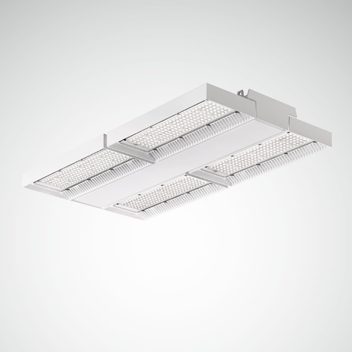 Projecteur LED de hall robuste. Convient pour une utilisation dans les entreprises certifiées HACCP, IFS et/ou BRC Global Standard Food. Avec température de surface limitée (DIN EN 60598-2-24, identifiant D). Système optique composé d’une optique à lentilles polycarbonate. À répartition symétrique intensive des intensités lumineuses. Flux lumineux du luminaire et couleur de la lumière fixes. Système LED composé de 4 modules LED, montés sur un support en aluminium. Flux lumineux du luminaire 35000 lm, puissance raccordée 205 W, rendement lumineux maximale du luminaire 171 lm/W. Teinte de lumière blanc neutre, température de couleur (CCT) 4000 K, indice général de rendu des couleurs (IRC) Ra > 80. Tolérance de localisation chromatique (initialement MacAdam) ≤ 3 SDCM. Durée de vie assignée moyenne L80(tq 50 °C) = 90.000 h, L80(tq 25 °C) = 100.000 h, Durée de vie assignée moyenne L90(tq 25 °C) = 50.000 h. Corps robuste en aluminium moulé sous pression aux ailettes de refroidissement intégrées. Surface revêtue de blanc (RAL 9016). Dimensions (L x l): 649 mm x 342 mm, hauteur du luminaire 63 mm. Température ambiante admissible (ta): -30 °C - +50 °C. Classe électrique (EN 61140) : I, indice de protection (norme EN 60529) : IP65, degré de résistance aux chocs selon la norme CEI 62262 : IK08, température d’essai au fil incandescent selon la norme CEI 60695-2-11 : 850 °C. Poids: 7.2 kg. Avec câble d'alimentation 5 pôles 5 x 0,75 mm2 (1500 mm). Avec 2 appareillages électronique, dimmables (DALI). Appareillage conf. au standard DALI 2 (EN 62386). Possibilité de commutation et de gradation du luminaire au moyen de la fonction bouton-poussoir via les bornes de commande DALI (TouchDim). L'appareillage est remplaçable conformément aux exigences d'écoconception (Règlement (UE) 2019/2020). Sur demande, le luminaire peut être doté de la fonctionnalité Monitoring Ready (MOR). Le produit répond aux exigences essentielles des directives européennes applicables et de la loi sur la sécurité des produits et porte le marquage CE. Le luminaire est en outre certifié ENEC par un organisme de contrôle indépendant.