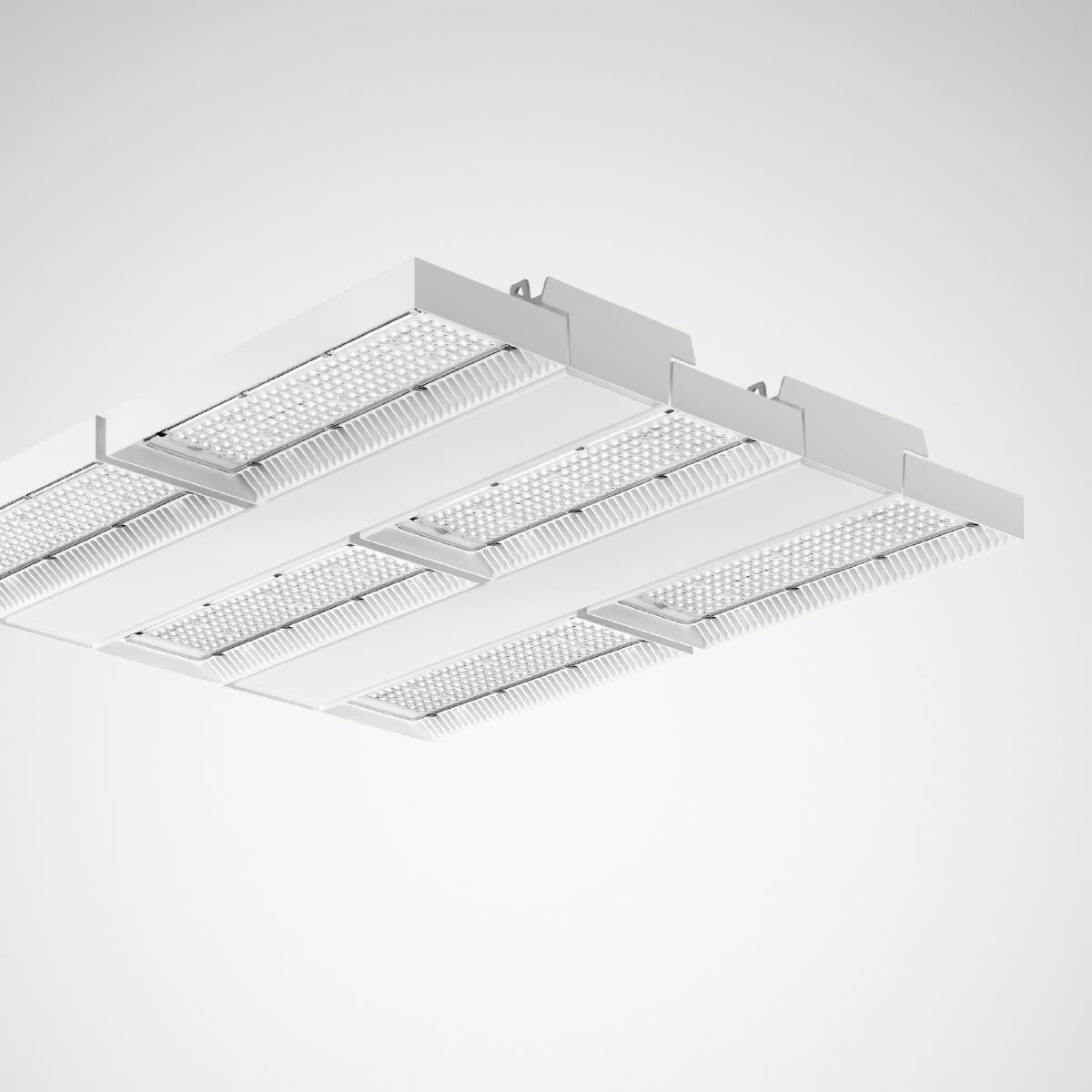 Projecteur LED de hall robuste. Convient pour une utilisation dans les entreprises certifiées HACCP, IFS et/ou BRC Global Standard Food. Avec température de surface limitée (DIN EN 60598-2-24, identifiant D). Système optique composé d’une optique à lentilles polycarbonate. À répartition symétrique intensive des intensités lumineuses. Flux lumineux du luminaire et couleur de la lumière fixes. Système LED composé de 6 modules LED, montés sur un support en aluminium. Flux lumineux du luminaire 53300 lm, puissance raccordée 315 W, rendement lumineux maximale du luminaire 169 lm/W. Teinte de lumière blanc neutre, température de couleur (CCT) 4000 K, indice général de rendu des couleurs (IRC) Ra > 80. Tolérance de localisation chromatique (initialement MacAdam) ≤ 3 SDCM. Durée de vie assignée moyenne L80(tq 45 °C) = 90.000 h, L80(tq 25 °C) = 100.000 h, Durée de vie assignée moyenne L90(tq 25 °C) = 50.000 h. Corps robuste en aluminium moulé sous pression aux ailettes de refroidissement intégrées. Surface revêtue de blanc (RAL 9016). Dimensions (L x l): 649 mm x 559 mm, hauteur du luminaire 63 mm. Température ambiante admissible (ta): -30 °C - +45 °C. Classe électrique (EN 61140) : I, indice de protection (norme EN 60529) : IP65, degré de résistance aux chocs selon la norme CEI 62262 : IK08, température d’essai au fil incandescent selon la norme CEI 60695-2-11 : 850 °C. Poids: 12.0 kg. Avec câble d'alimentation 5 pôles 5 x 0,75 mm2 (1500 mm). Avec 2 appareillages électronique, dimmables (DALI). Appareillage conf. au standard DALI 2 (EN 62386). Possibilité de commutation et de gradation du luminaire au moyen de la fonction bouton-poussoir via les bornes de commande DALI (TouchDim). L'appareillage est remplaçable conformément aux exigences d'écoconception (Règlement (UE) 2019/2020). Sur demande, le luminaire peut être doté de la fonctionnalité Monitoring Ready (MOR). Le produit répond aux exigences essentielles des directives européennes applicables et de la loi sur la sécurité des produits et porte le marquage CE. Le luminaire est en outre certifié ENEC par un organisme de contrôle indépendant.
