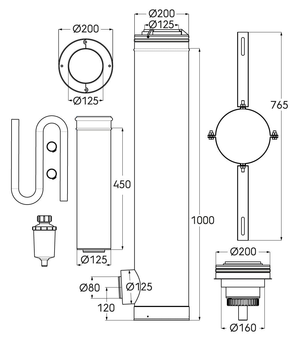 Kit 3CEp Départ diamètre 125/200 Polypropylène/acier système suspension avec connexion 1 appareil 80/125 pour système concentrique pour appareil à condensation.