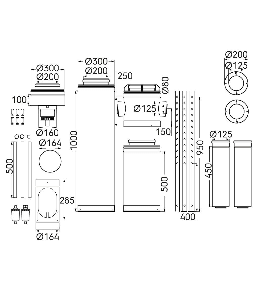 Kit départ pour système collectif concentrique 3CET diamètre 200/300 avec piquage 80/125 pour 2 appareils à 180° avec support trépied sol.
