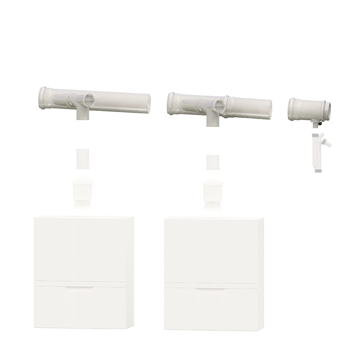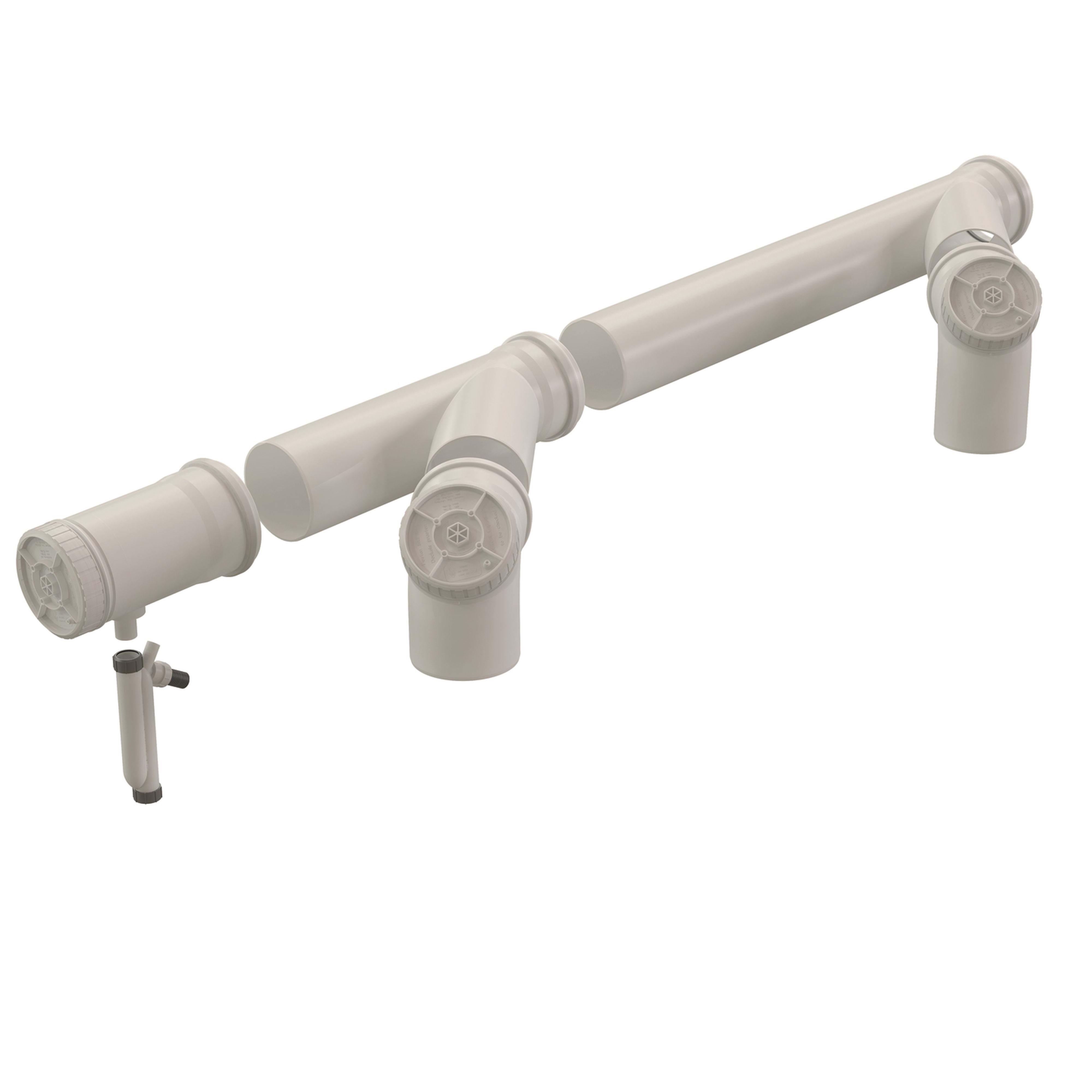 Ce kit de base pour deux chaudières permet la mise en œuvre du Chemilux Cascade Condensation. Il contient deux coudes de visite, deux conduits collecteurs, un tampon de visite et un siphon. Un clapet anti-retour peut être fournit (en option). Les conduits sont en PPtl ce qui permet de visualiser l'intérieur du conduit, sans démontage et facilite donc l'entretien.