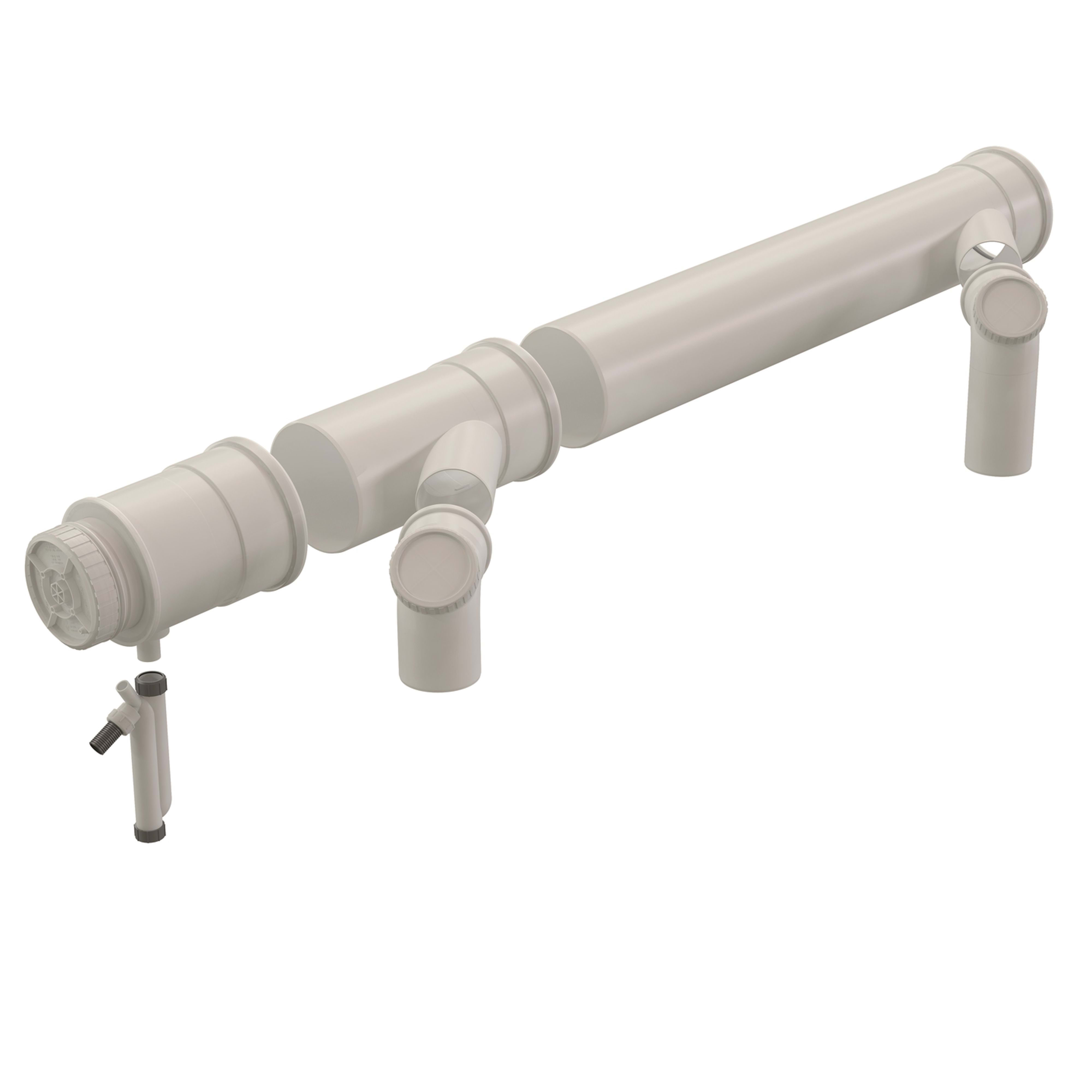 Ce kit de base Cascade Condensation permet de raccorder deux chaudières. Il contient : coudes de visite, collecteur, tampon de visite et siphon. Les conduits PPTL permettent de visualiser l'intérieur du conduit sans démontage, idéal pour la maintenance.