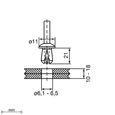 Rivets plastique naturel Ø6 x 21 U60X. Pour la fixation isolante de la goulotte de câblage. Perçage 6,1 mm < Ø < 6,5 mm et épaisseur platine + Goulotte 10 mm < e < 18 mm.