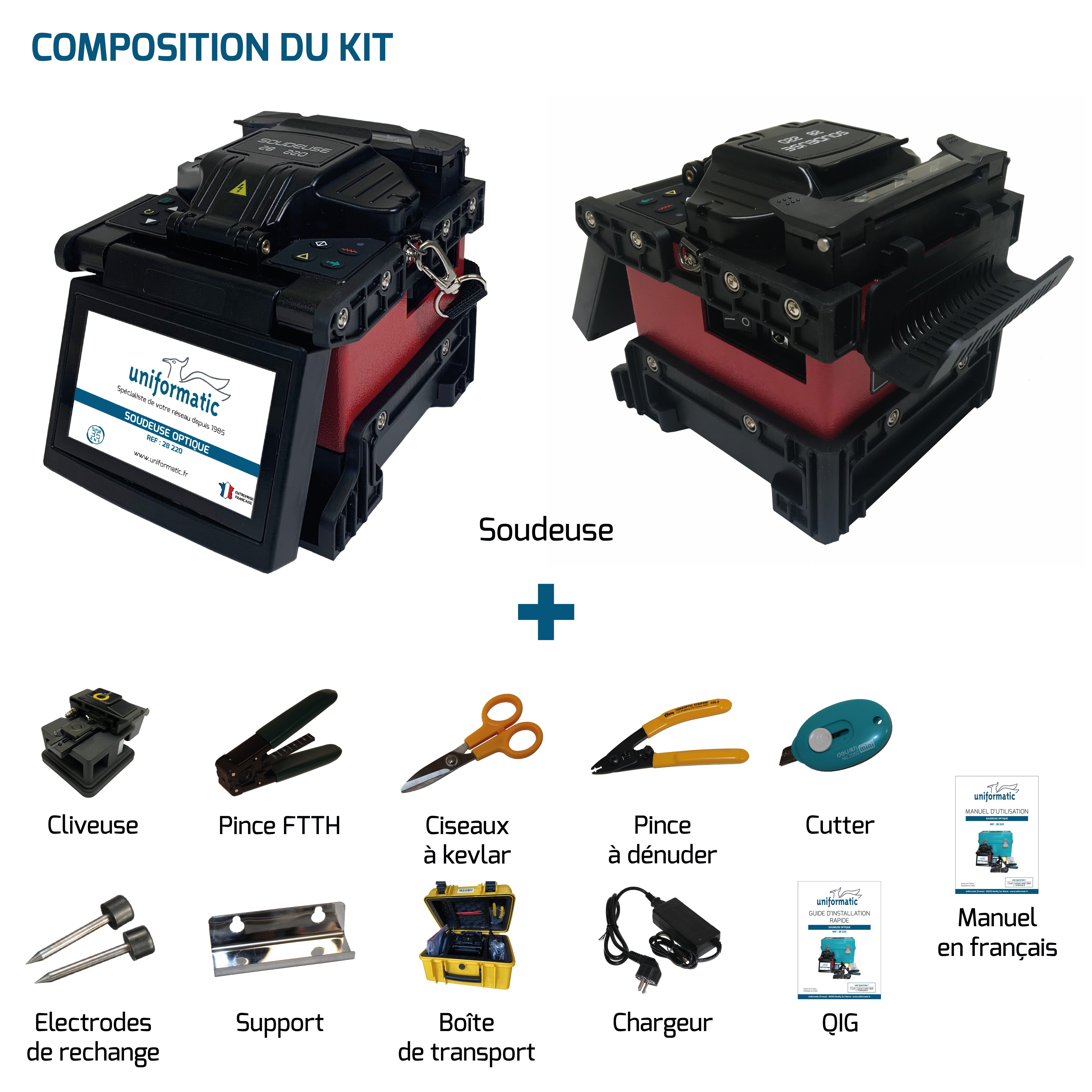 La soudeuse optique est l'outil de production qui va permettre à l’installateur fibre optique d'effectuer la fusion de ses fibres sur site. Cet équipement vous assure la fusion définitive de 2 fibres entre elles. Le signal lumineux peut ainsi circuler entre les 2 fibres sans perte optique. La soudeuse optique effectue automatiquement l'alignement cœur à cœur et la fusion pour une utilisation simplifiée. Le four assure le chauffage de la protection d’épissure afin de rigidifier et de protéger la soudure optique. Son format compact et léger assure un confort d'utilisation au quotidien.l'écran LCD (interface en français) vous permet d'apprécier la qualité de clivage des fibres et de la fusion. Le kit se compose de : x1 soudeuse, x1 cliveuse, x1 pince FTTH, x1 paire de ciseaux, x1 pince à dénuder, x1 cutter, x2 électrodes, x1 support soudeuse, x1 boîte de rangement, x1 chargeur soudeuse, x1 manuel d'utilisation et x1 guide d'installation.