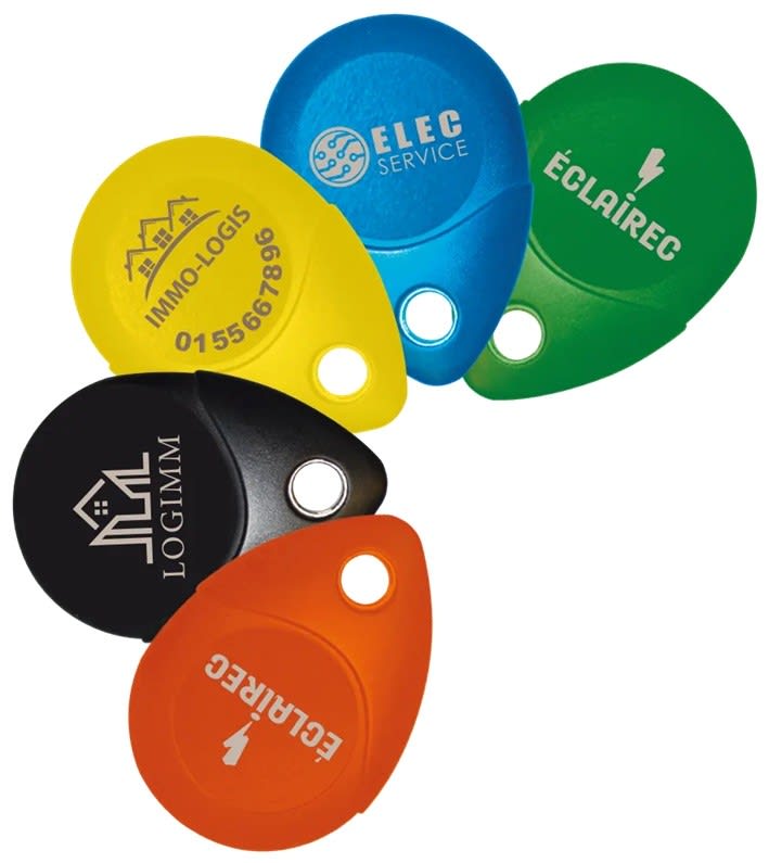 Clé de proximité personnalisée Mifare 13.56 MHz noire, en ABS V0 ininflammable, avec œillet métallique pour résidents. Étanchéité IP68, résistance aux chocs IK8. Résiste de -30°C à +80°C