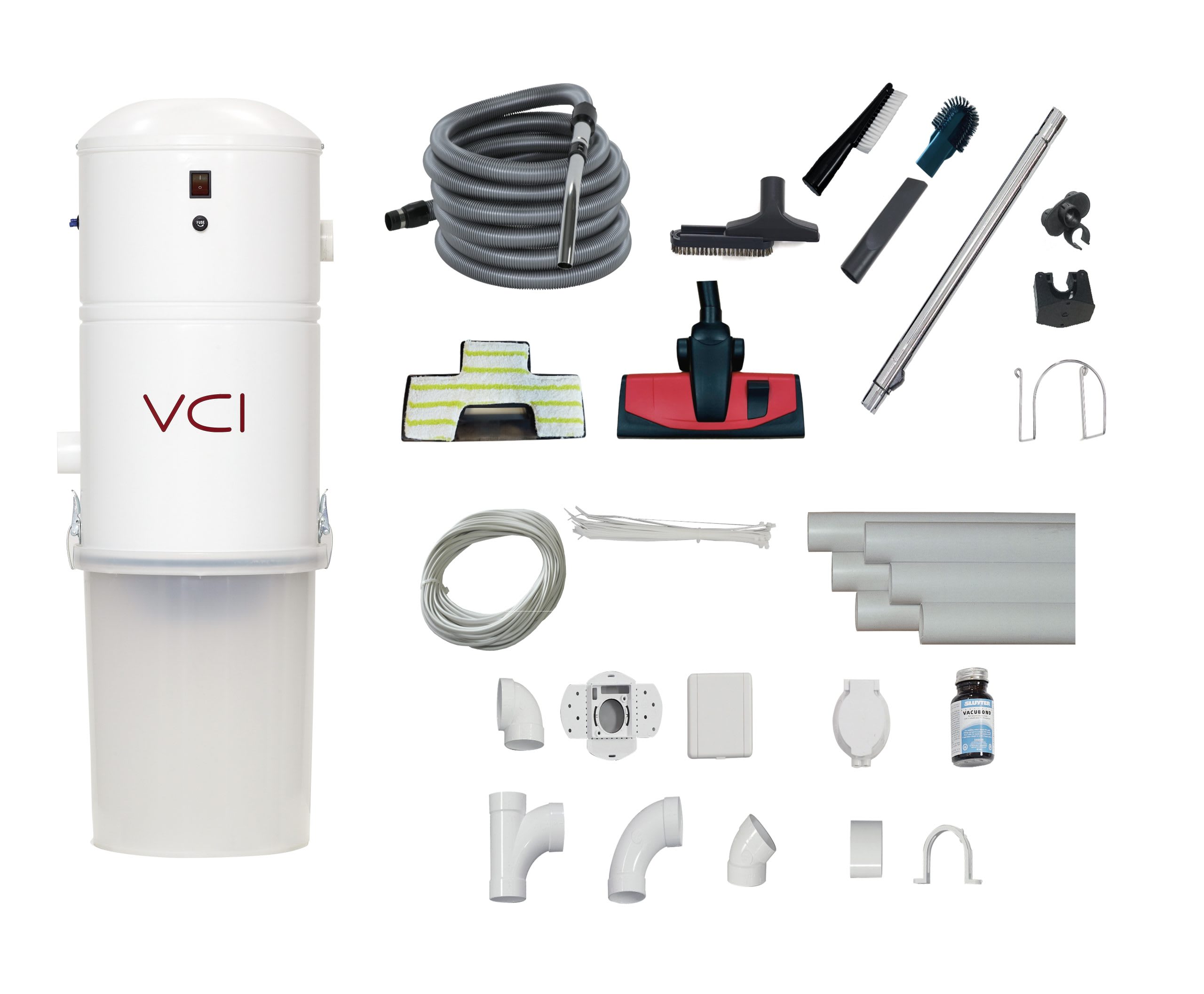 Pack complet pour surface habitable jusqu'à 120M² + dépendances incluant 1 centrale CE1S, 1 ensemble d'accessoires VA75, 3 prises V550B, 3 raccords de prise V55C, 1 prise de service V201P, 1 kit d'installation pour 3 prises