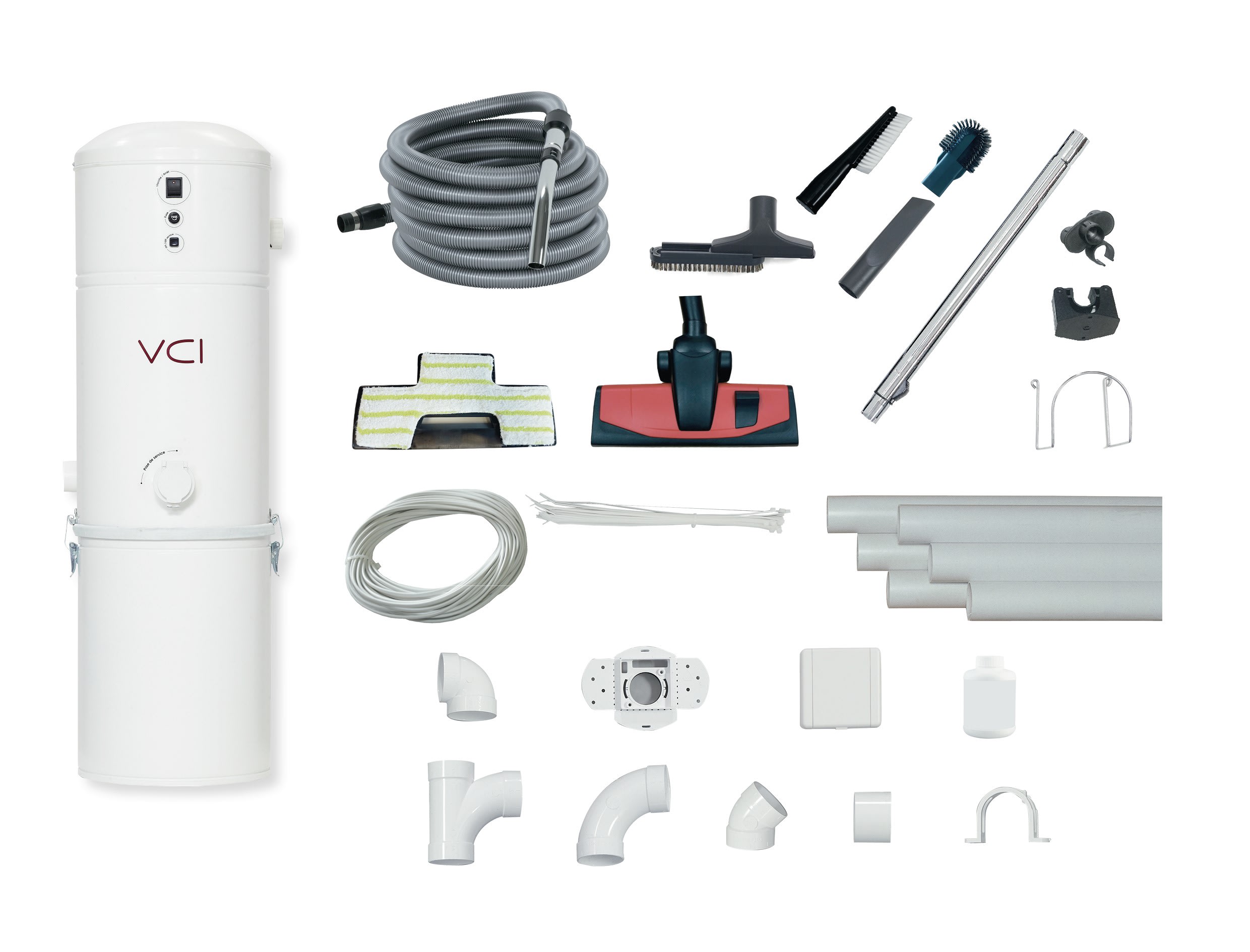 Pack complet pour surface habitable jusqu'à 320M² + dépendances incluant 1 centrale CB3S, 1 ensemble d'accessoires VA75, 6 prises V550B, 6 raccords de prise V55C, 1 prise de service intégrée à la centrale, 1 kit d'installation pour 6 prises