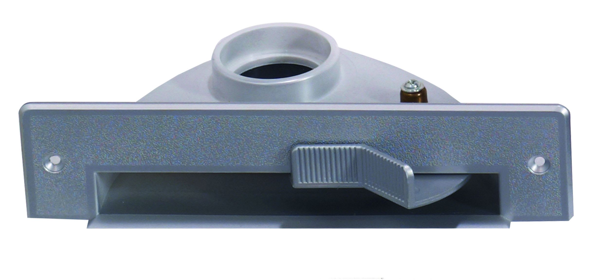 Trappe aspirante de cuisine grise seule 21,7 X 5,5 cm. Intégrée dans la plinthe d'un meuble, vous balayez vers la trappe. Pratique pour les miettes de la cuisine ou les cheveux de la salle de bain.