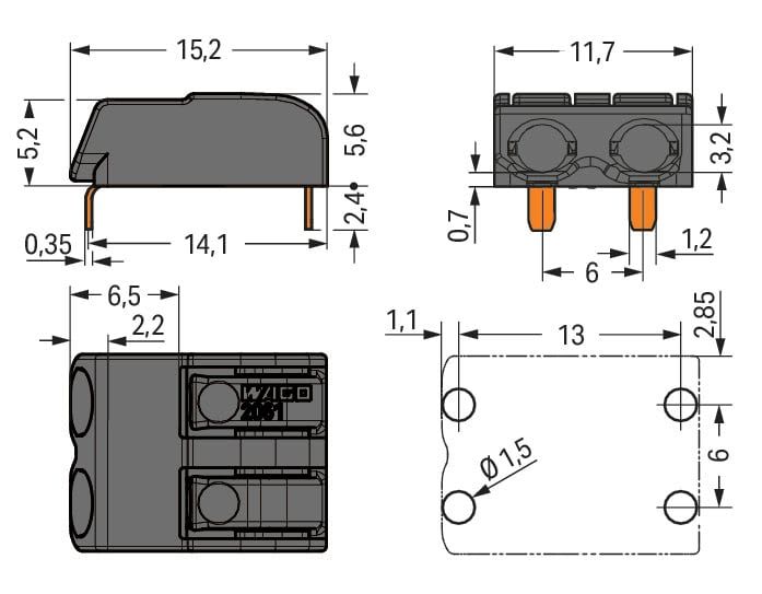 Wago Contact - Borne pour CI THR Bouton-poussoir 1,5mm² pas 6mm 2 pôles, noir - 2061-1622/998-404