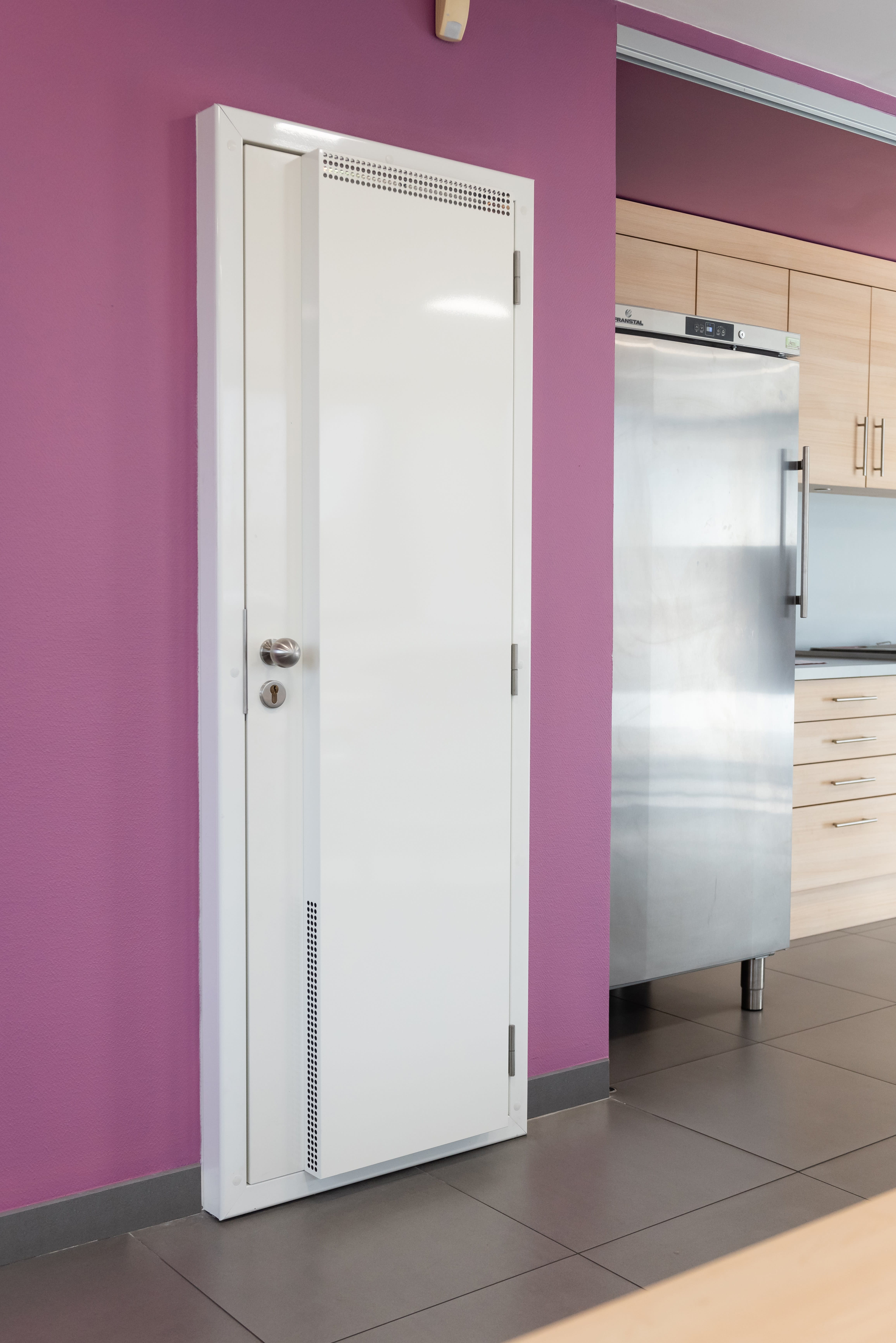 Bloc porte isolé équipé d'un climatiseur de cave à vin compact-Couleur blanc-ouverture en tirant de droite à gauche-pose facile de la porte en applique-froid 450 W-fluide R290-filtre à poussières-monophasé 230 V 50 Hz-puissance absorbée max 390 W-plage de fonctionnement 8 à 18 °C-jusqu'à 35°C extérieur-maxi 15 m3 avec isolation