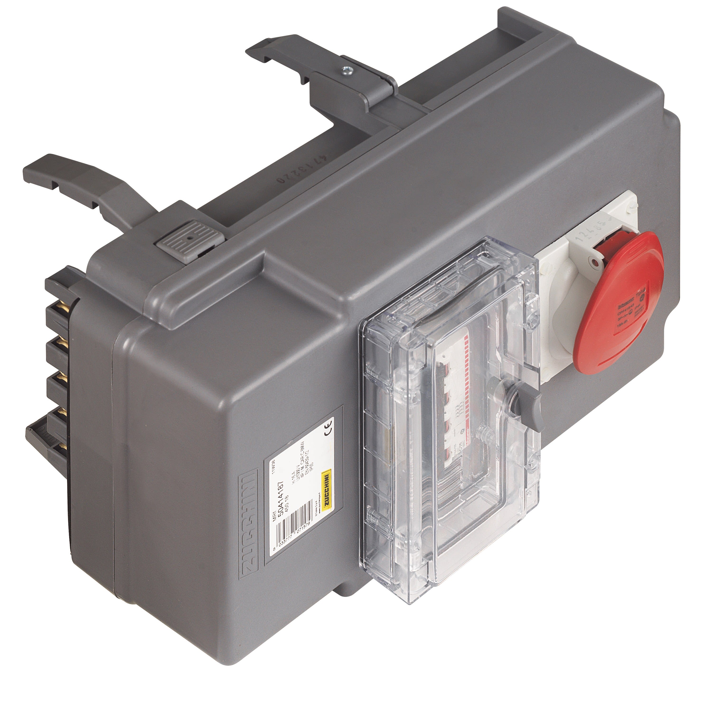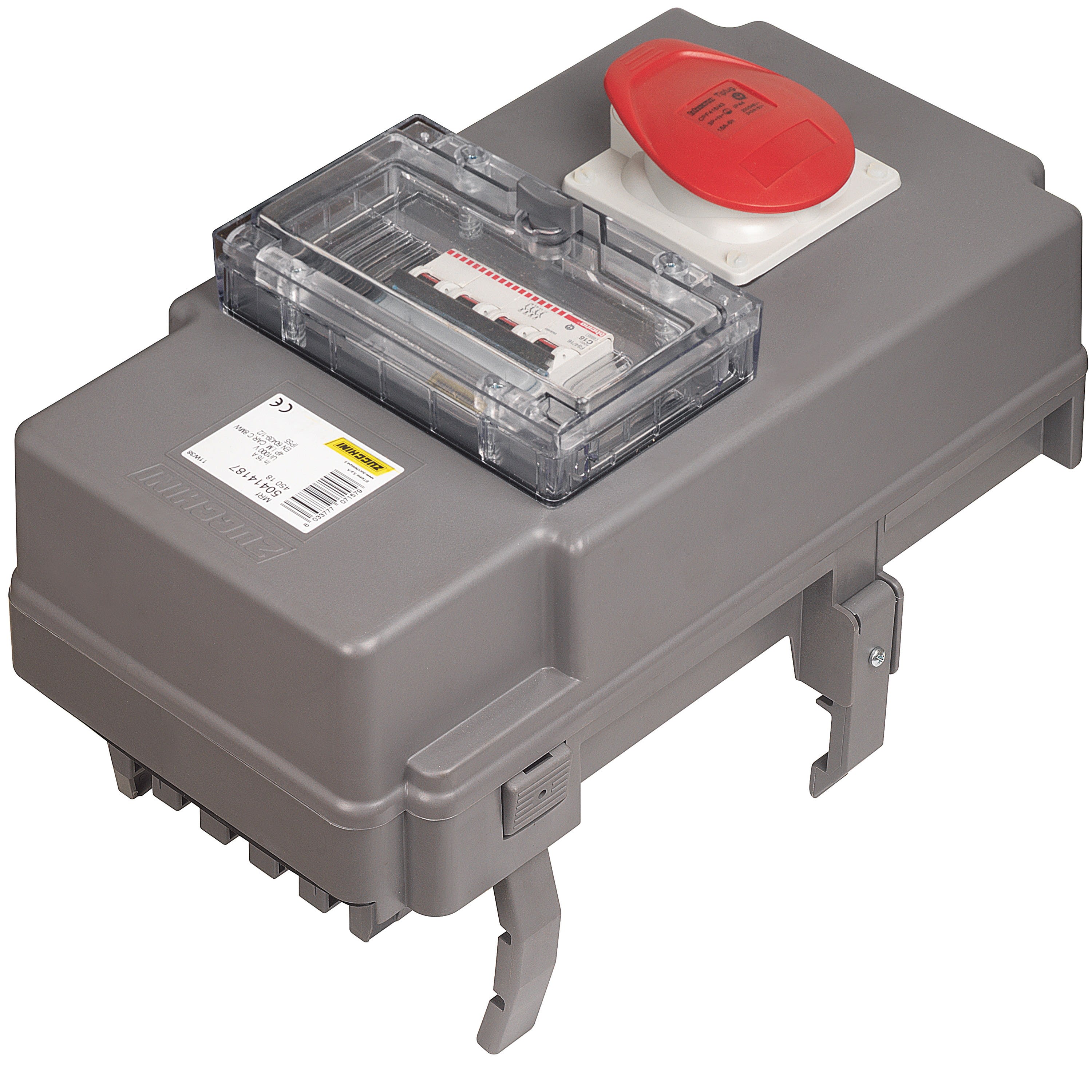 Boîte de dérivation MR pré-équipé avec disjoncteur 16A 4P courbe C et prise 3P+N+T Couvercle avec fenêtre-plastron transparente Degré de protection IP55 Conforme aux normes EN 61439-6 et IEC 61439-6