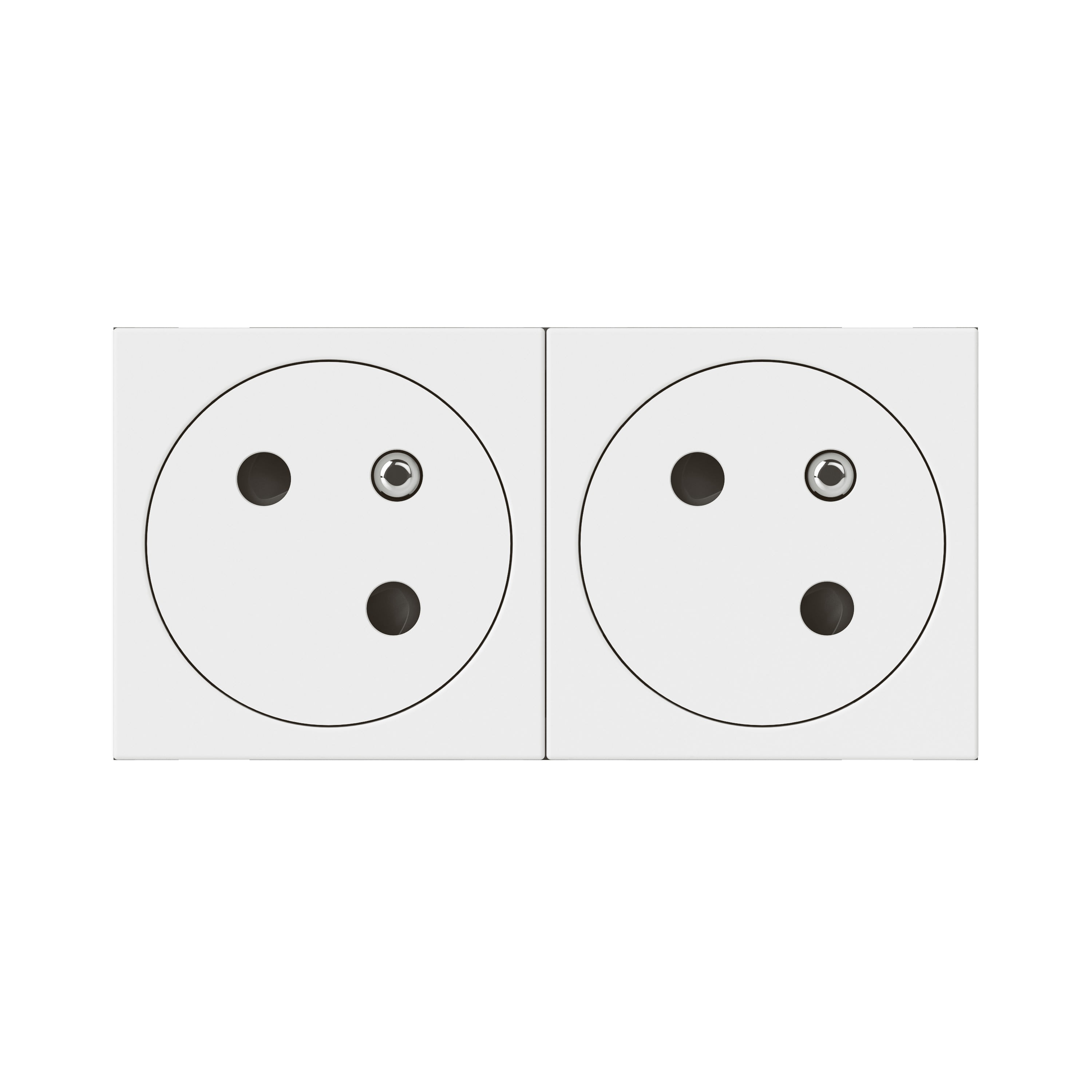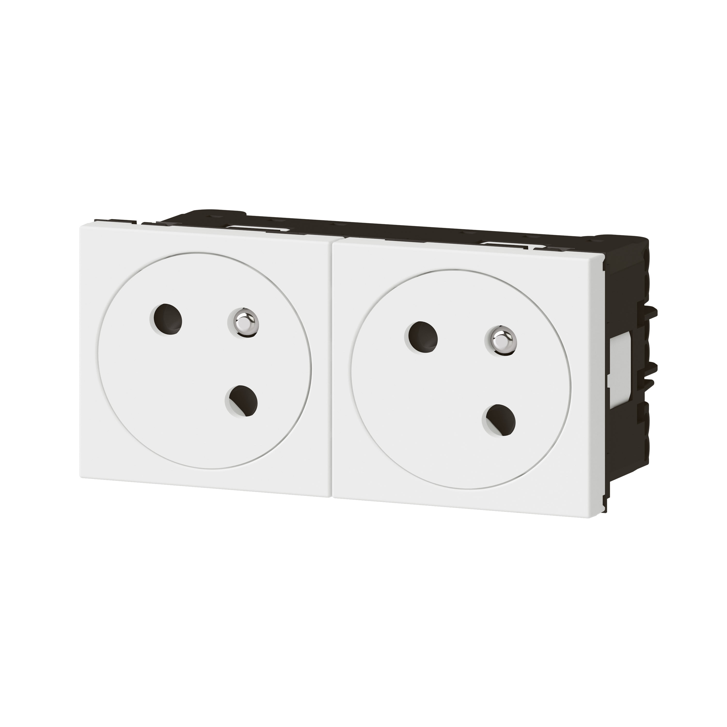 Prise de courant 2x2P+T Surface Mosaic Link 16A 230V à connexion latérale par bornes automatiques bi-stables - À équiper d'un support et d'une plaque Mosaic 4 modules - Blanc L'inclinaison à 45° des puits de prise permet de gagner de la place lors du branchement de plusieurs appareils electriques ou electroniques volumineux Résistance aux chocs renforcée : indice IK07 Connexion par bornes automatiques à levier permettant la connexion rapide sans outil