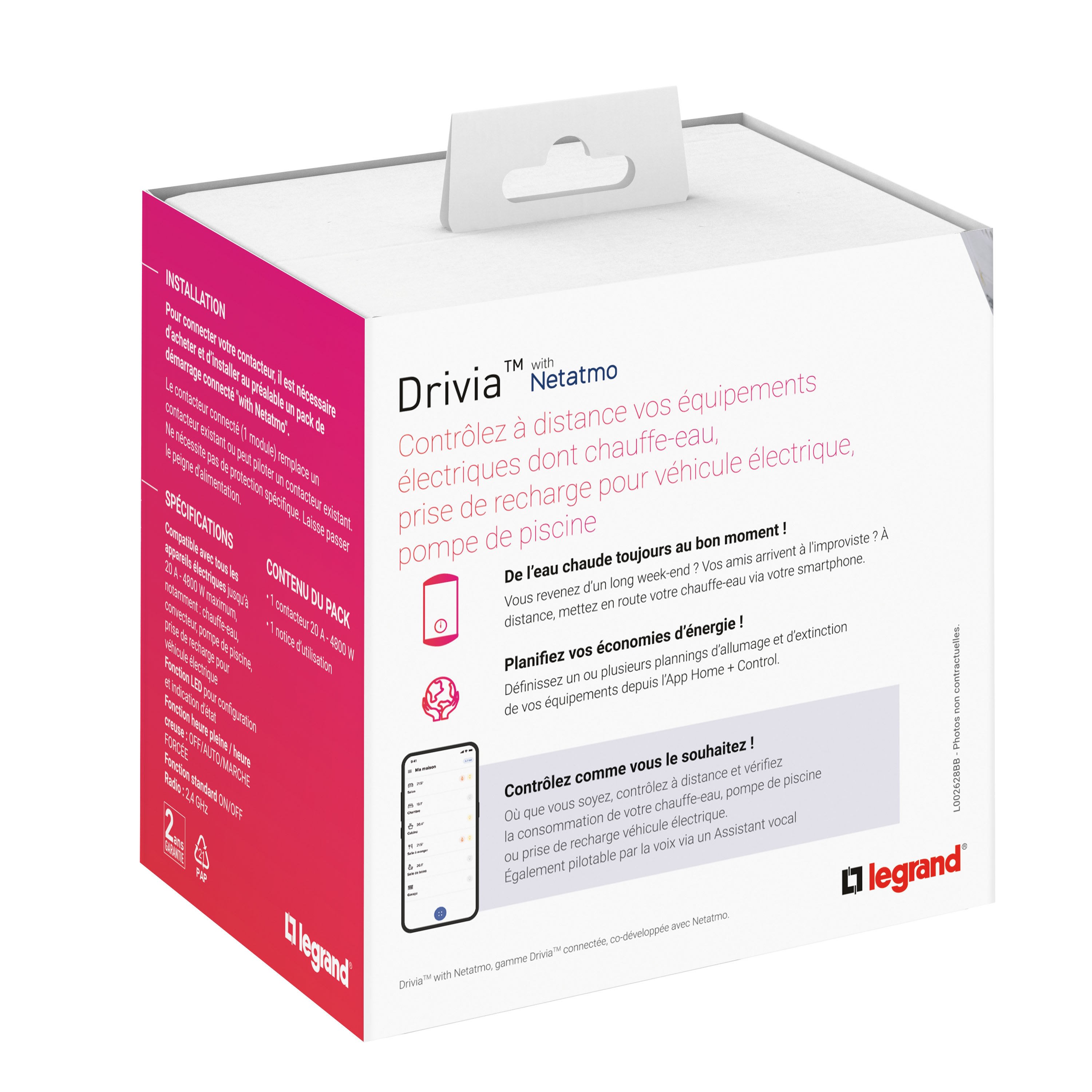 Contacteur multifonction silencieux Drivia with Netatmo 20AX - 230V~ - 50Hz pour pilotage de tous types de charges (chauffe-eau, chauffage, prise de recharge VE...) Bornes amont de raccordement de phase auto-protégée : ne nécessite pas de disjoncteur 2A (enlever ce disjoncteur si déjà présent en cas de remplacement d'un contacteur standard) Fonctions :- heures pleines / heures creuses- de puissance ON/OFF et pour moteur (pompe piscine...) Permet via l'App. Home + Control :- la saisie du mode de fonctionnement du contacteur (HP/HC ou ON/OFF) en fonction de la nature de la charge (chauffe-eau ou autre charge)- la mesure et le suivi de la consommation (kWh) du circuit piloté- la commande d'un autre contacteur supérieure à 20A mono ou triphasé- la commande d'appareils électriques jusqu'à 4800W ou de moteurs jusqu'à 2400VA ou de prises pour véhicules électriques jusqu'à 16A VE)- la mise en place d'automatismes via la production solaire 1 modules 17,5mm - Bornes à vis - Conforme à la norme NF EN 60669-2-1