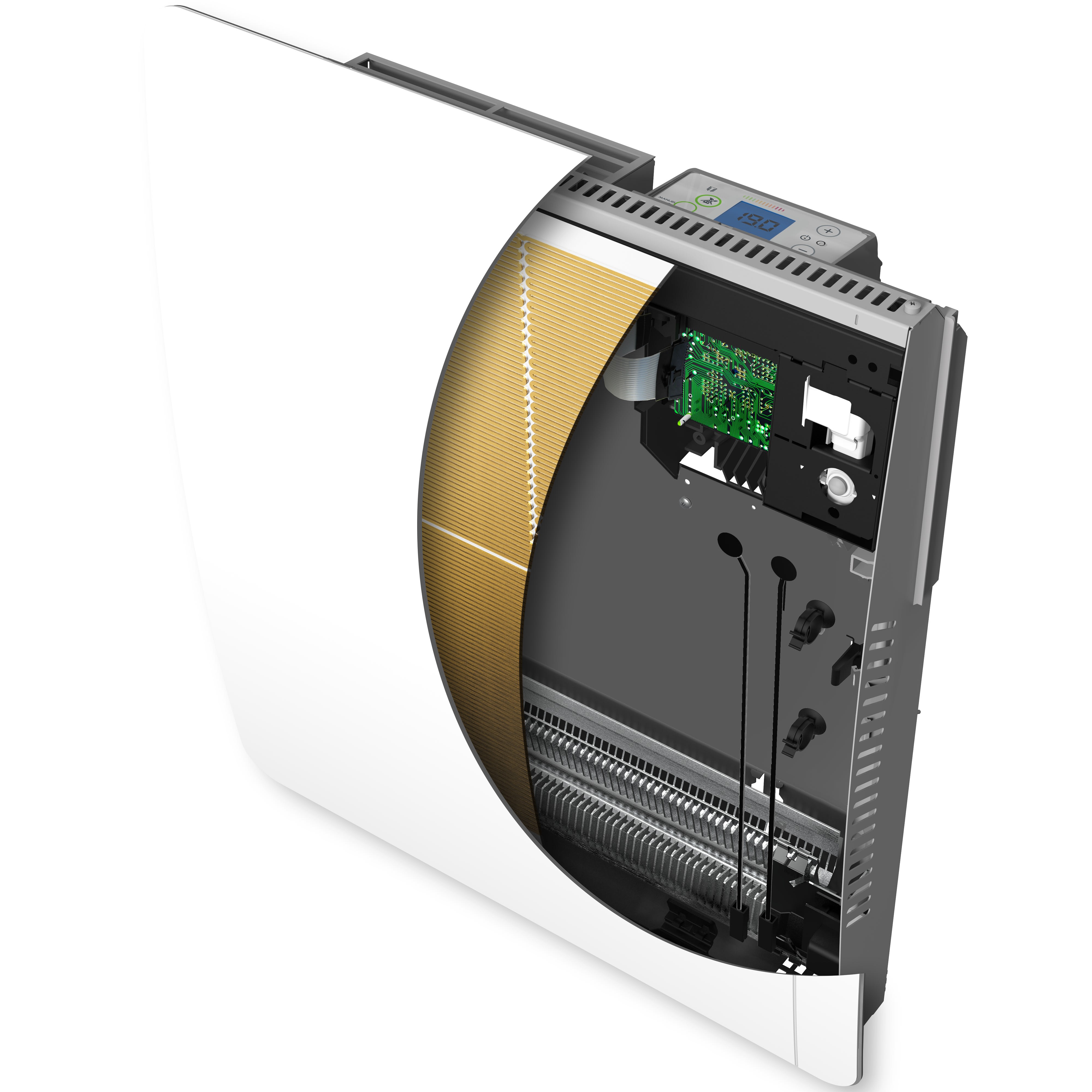 La technologie double élément chauffant avec façade prioritaire, garantie la permanence d'une sensation de chaleur douce très agréable même à bas régime. Réactif l'élément monobloc aluminium arrière, complète la chauffe en cas de besoin. ETIC est certifié NF performance 3 étoiles oeil . Cette certification garantie le plus haut niveau de performance en matière de confort et de fonctions avancées d'économie d'énergie est recommandée dans le cadre des DPE. Une gestion facile des économies d'énergie en mode local ou depuis un smartphone en mode connecté, grâce à l'application intuis connect with Netatmo.* Un design discret et élégant avec ses facades légèrement galbées. Sa finition bicolore blanc satiné lisse avec un fond gris souris pour adoucir l'emprunte visuelle au mur. Etic se décline en 2 formats, horizontal compact et vertical étroit.