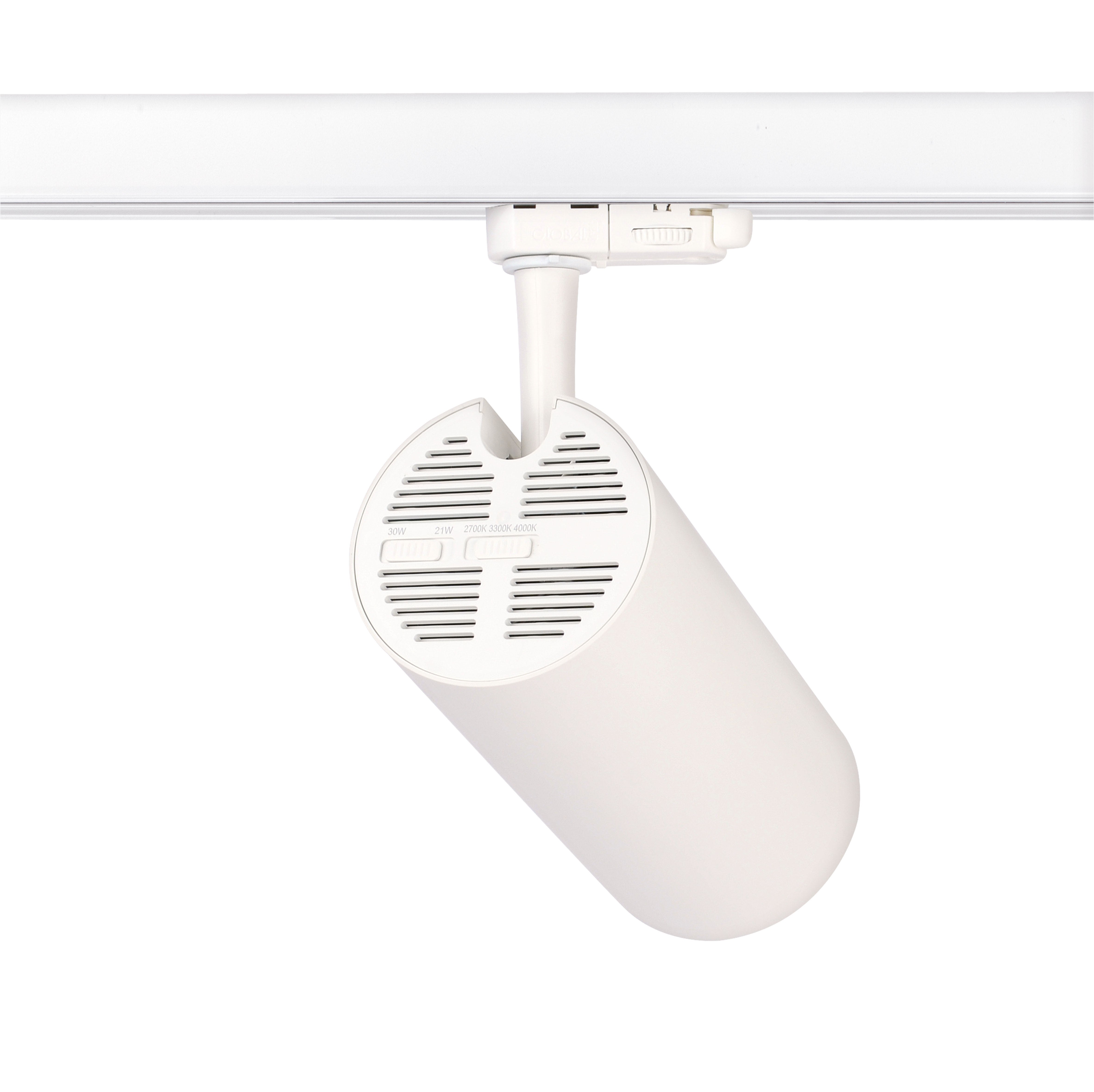 Pour l'éclairage commercial, nouveau luminaire sur rail Triphasé, POLARIS 023 45° 21/30W 3CCT BLANC, Deux puissances réglables à l’arrière du spot, Technologie CCT : 2700 K / 3300 K/4000 K Interrupteur à l’arrière du spot, Éclairage sans scintillement, Éclairage à 45°