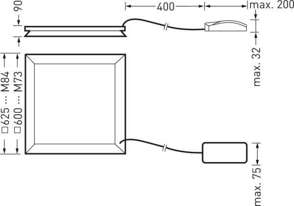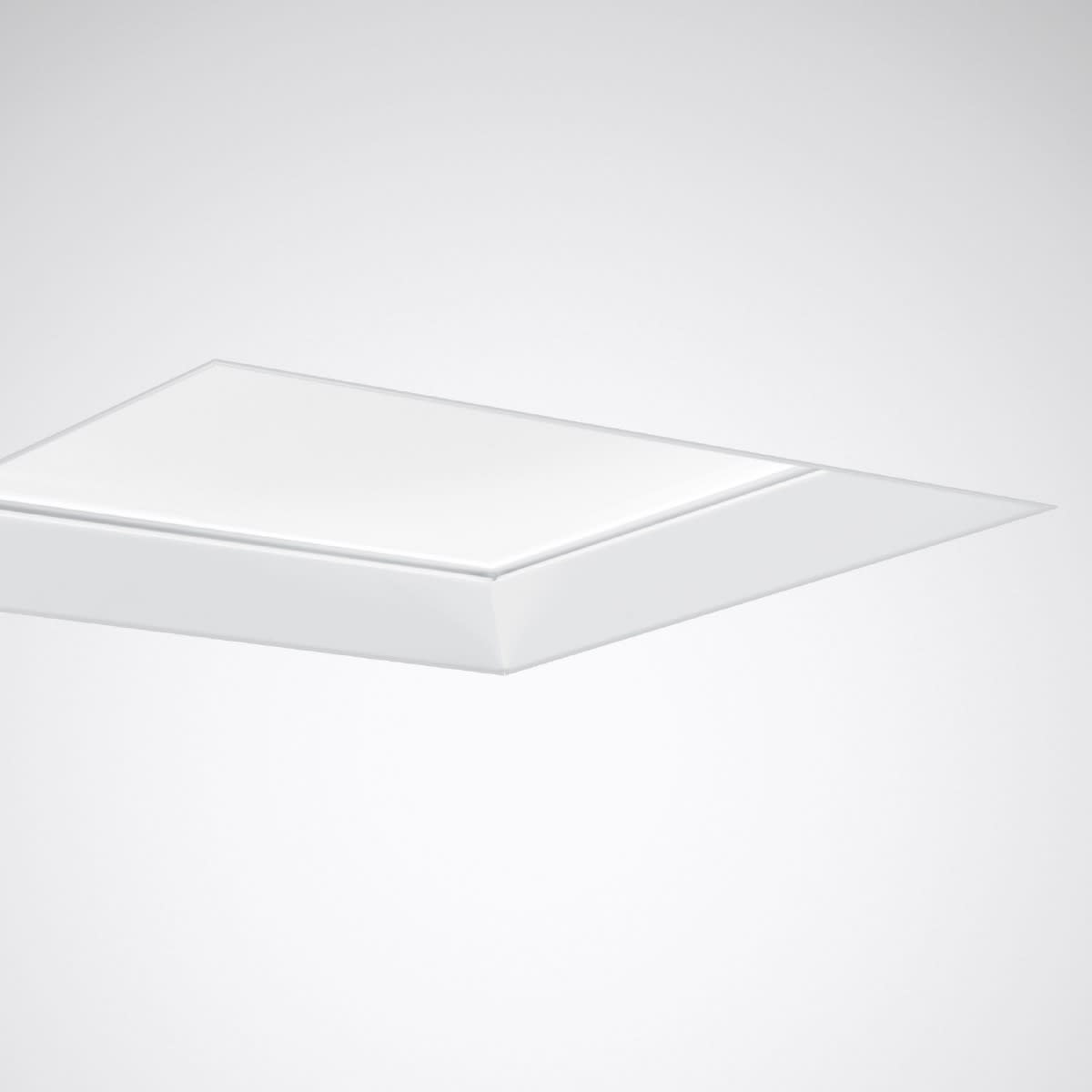 Plafonnier LED carré, à recouvrement à prismes en PMMA. Version M73 (600 mm x 600 mm). Cadre SKY pour un effet de profondeur de l’ambiance intérieure dans un plafond modulaire classique et plat. Le cadre SKY reproduit les contours tridimensionnels d’un éclairage zénithal. Le luminaire peut être équipé en option d’un système d’éclairage de secours à encastrer au plafond, fonctionnant trois heures. Flux lumineux du luminaire en mode de fonctionnement d’éclairage de secours 575 lm. Pour une répartition intensive des intensités lumineuses. Compatible avec les écrans informatiques selon la norme EN 12464-1 grâce à des luminosités réduites L ≤ 3 000 cd/2 pour des angles d’éclairage supérieurs à 65 °, de manière omnidirectionnelle. Effet lumineux harmonieux grâce à une sortie de lumière uniformément éclairée. Flux lumineux du luminaire 4200 lm, puissance raccordée 31,00 W, rendement lumineux du luminaire 135 lm/W. Teinte de lumière blanc neutre, température de couleur (CCT) 4000 K, indice général de rendu des couleurs (IRC) Ra > 80. Durée de vie assignée moyenne L80(tq 25 °C) = 100.000 h. La source lumineuse est remplaçable conformément aux exigences d'écoconception (Règlement (UE) 2019/2020). Corps de luminaire en tôle d’acier. (RAL 9016). Dimensions (L x l): 598 mm x 598 mm, hauteur du luminaire 90 mm. Indice de protection par le dessous IP40. Classe électrique (EN 61140) : II, indice de protection (norme EN 60529) : IP20, degré de résistance aux chocs selon la norme CEI 62262 : IK03, température d’essai au fil incandescent selon la norme CEI 60695-2-11 : 650 °C. Poids: 5.0 kg. Avec bornier de raccordement 5 pôles jusqu’à 2,5 mm2 pour raccordement secteur et repiquage secteur. Raccord et transmission DALI jusqu’à 1,5 mm2. Le raccordement secteur du ballast s’effectue au moyen d’un bornier de raccordement. Pour une installation simple et rapide, le raccordement entre le luminaire et le branchement secondaire du ballast s’effectue au moyen d’un connecteur. Avec driver externe dimmable (DALI). Appareillage conf. au standard DALI 2 (EN 62386). Possibilité de commutation et de gradation du luminaire au moyen de la fonction bouton-poussoir via les bornes de commande DALI (TouchDim). L'appareillage est remplaçable conformément aux exigences d'écoconception (Règlement (UE) 2019/2020). Appareillage protégé contre le mode à vide, les raccordements incorrects, les courts-circuits, surcharges et surtempératures. Ondulation de sortie de l’appareillage ≤ 4 % pour une commande efficace du système LED et une lumière sans scintillement. Il est possible de raccorder le luminaire sans problème même à l’appareillage sous tension. Le luminaire convient à un fonctionnement sur un réseau à tension continue 230 V. Sur demande, le luminaire peut être doté de la fonctionnalité Monitoring Ready (MOR). Le produit répond aux exigences essentielles des directives européennes applicables et de la loi sur la sécurité des produits et porte le marquage CE.