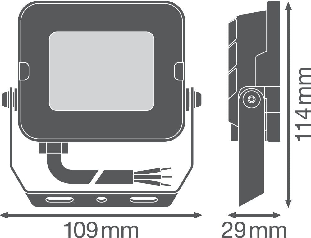 Projecteur avec un flux lumineux allant jusqu'à 1000 lm. Caractéristiques du produit: Distribution symétrique de la lumière basée sur un réflecteur avec un angle de faisceau de 100° x 100°. Support de montage avec angle de 30° et large zone de rotation. Câble flexible préinstallé de 1 m (H05RN-F), 3 fils de 1,0 mm² enroulés. Avantages du produit: Robuste, mais léger et design compact. Éclairage uniforme et de qualité, grâce au diffuseur dépoli en verre trempé. Aucun flux lumineux au dessus de la ligne d'horizon (ULR 0%) lorsqu'il est monté à 0° d'inclinaison. Économies d’énergie pouvant atteindre 90% par rapport aux projecteurs de lampe halogène. Garantie de 3 ans. Zones d'application: Remplace les projecteurs halogènes. Utilisation en extérieur (IP65). Espaces publiques. Façades de bâtiments. Jardins, balcons et autres espaces extérieurs. Zones de construction. Conseils de sécurité: Le câble ou cordon flexible externe de ce luminaire ne peut pas être remplacé ; si le cordon est endommagé, le luminaire doit être détruit.. Bornier non inclus. L'installation doit être effectuée par une personne qualifiée.. Attention, risque de choc électrique.. Produit de classe de protection I. Toutes les pièces métalliques conductrices d'électricité du boîtier qui peuvent absorber une tension pendant le fonctionnement ou pendant la maintenance en cas de défaut doivent être reliées en permanence au conducteur de protection..