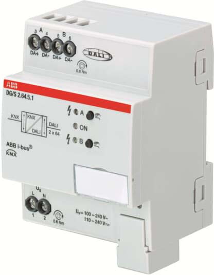 Pour la commande d'appareils DALI via ABB i-bus® KNX. Deux sorties DALI pour jusqu'à 2 x 64 esclaves DALI. L'alimentation DALI est intégrée. La commande et le retour d'état sont effectués via KNX par esclave DALI (2 x 64), avec groupes d'éclairage (2 x 16), ensemble en diffusion ou par scènes (2 x 16) Appareils DALI type DT1 (convertisseur de secours autonome selon EN 62386-202) et type DT8 (température de couleur Tc / blanc accordable selon. EN 62386-209) sera pris en charge. De nombreux messages d'erreur et de défaut sont disponibles.des tests (par ex. test de fonctionnement et de durée) peuvent être déclenchés, les résultats des tests sont renvoyés à KNX. Avec les appareils DT8, Dim2Warm, HCL, régler et atténuer la température de couleur sont possibles. Les fonctions esclave, escalier, force, blocage et scène sont intégrées. Les commentaires sont envoyés. Le débit des télégrammes DALI peut changer.Pour le diagnostic et le changement individuel de l'adresse DALI ou de l'affectation de groupe, un outil logiciel séparé est disponible.
