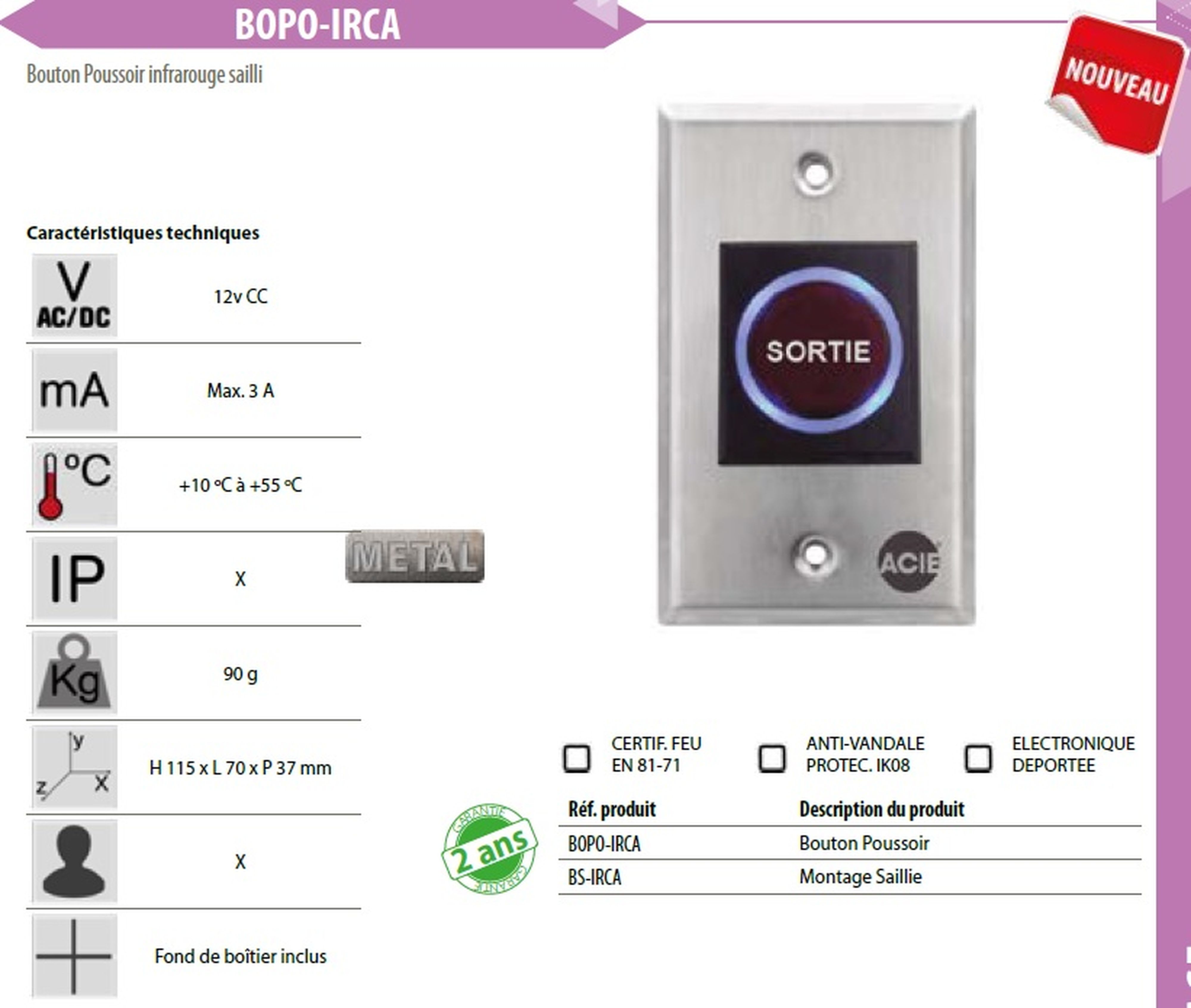 Acie Automatisme - Bouton poussoir ir avec fond de boitier métallique - 1BOPO-IRCA