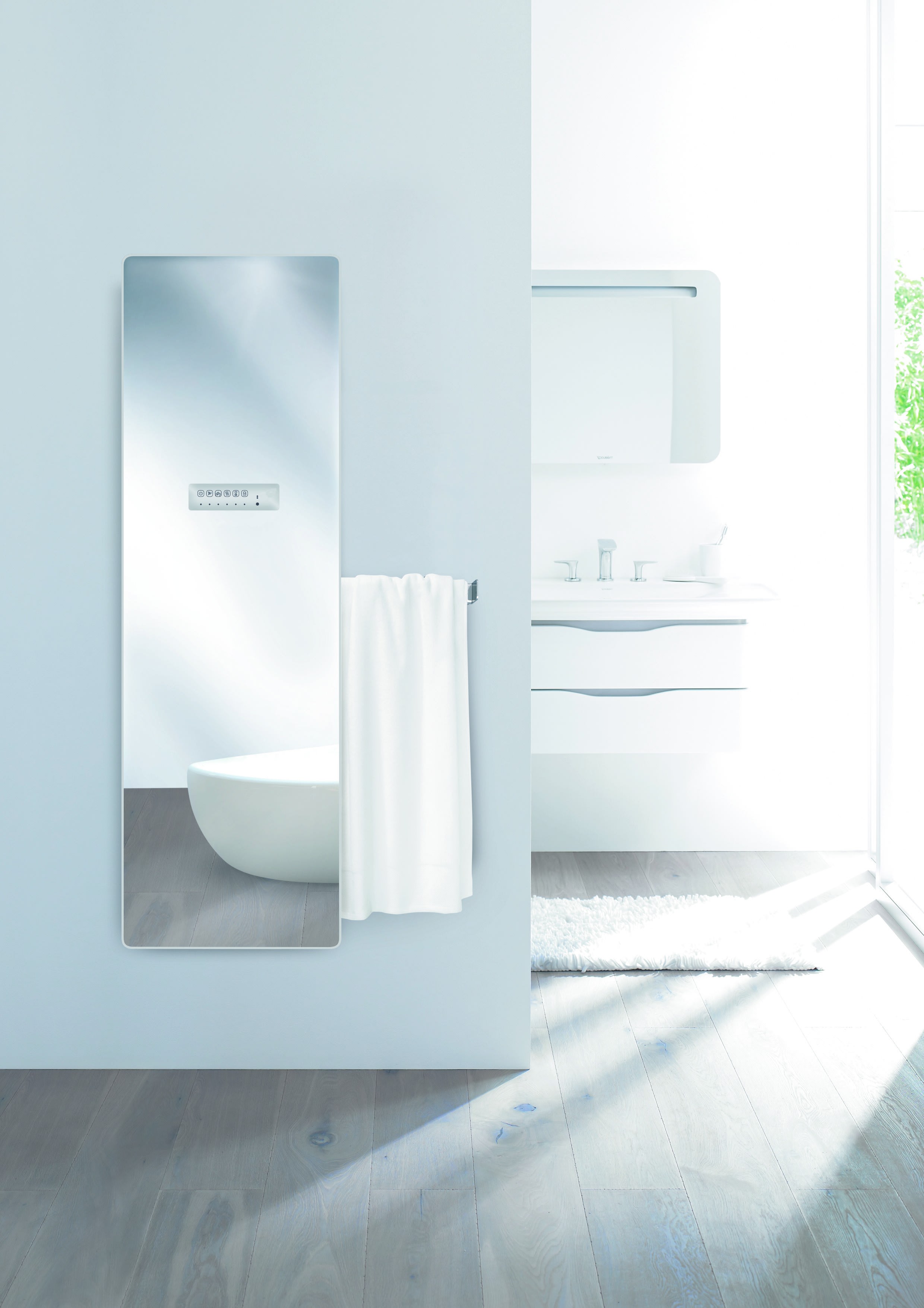 Les serviettes sèchent en toute discrétion grâce aux barres porte-serviettes rétractables. Avec surface en verre en finition noire, blanc ou miroir. Existe en version électrique.