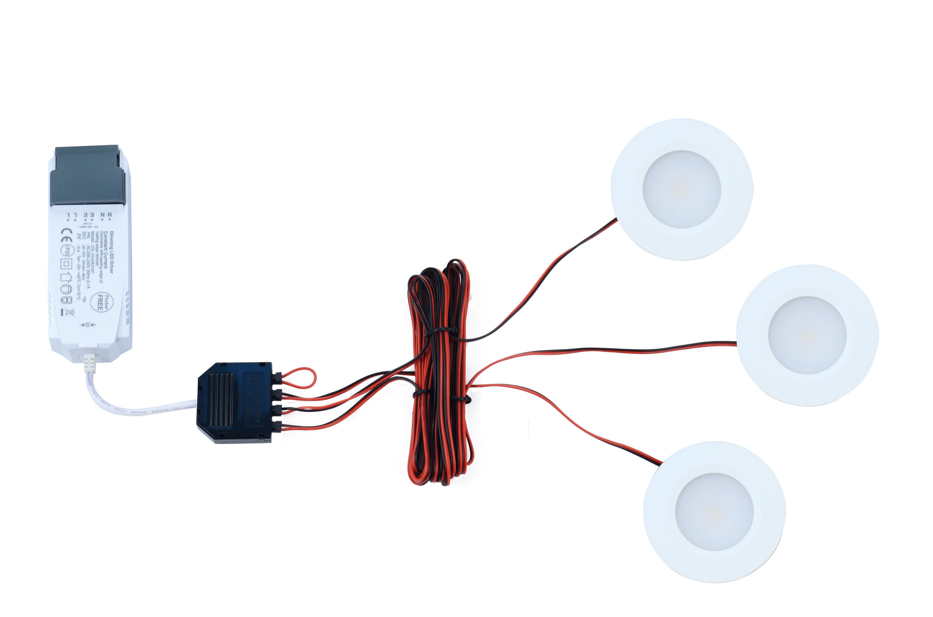 - Kit de 3 spots encastrés dimmables ip20-65, ik02, 320lm chacun, 35000h. idéal salle d'eau (vol,2) et meuble. faible épaisseur (15mm). fourni avec alimentation et pré-câblés avec connecteurs sans outil.