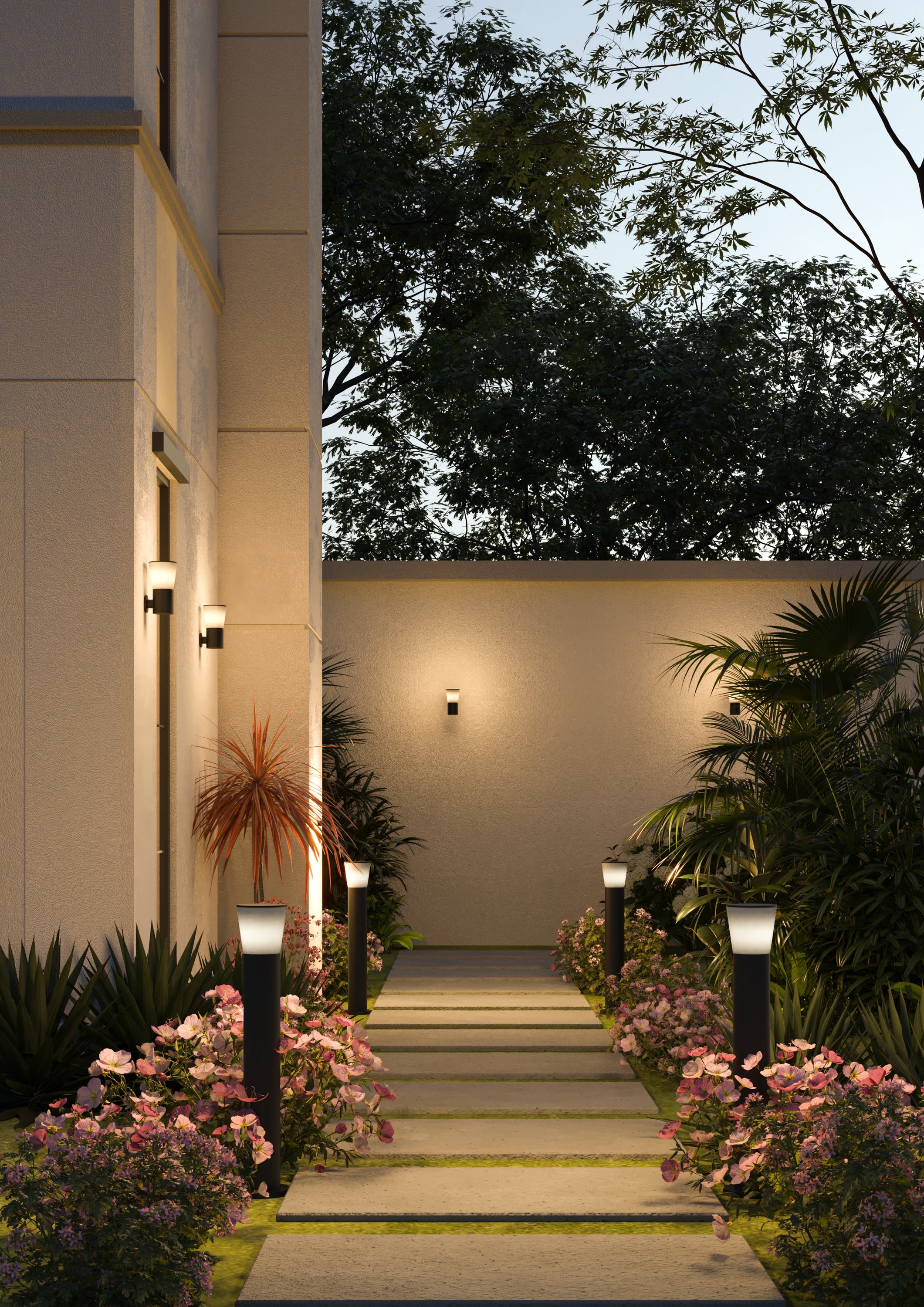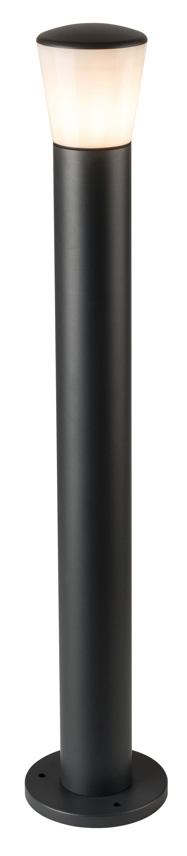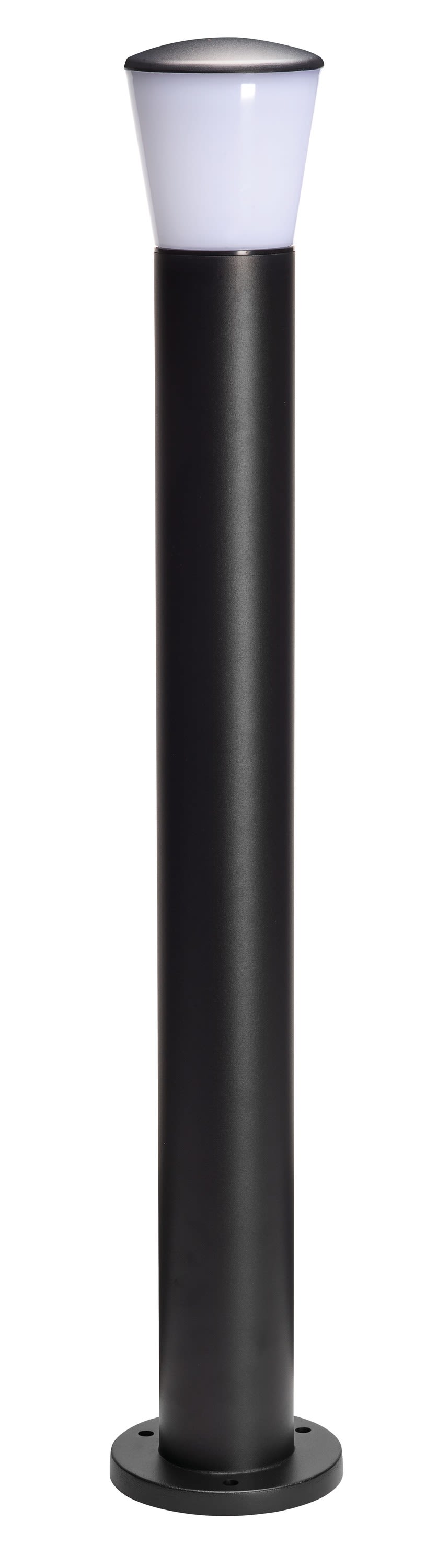 Culot E27, lampe remplaçable, protégé par un diffuseur opaque en PC - Faisceau lumineux orienté vers le bas, conforme à la règlementation sur la pollution lumineuse - Hauteur de 80cm, avec point de fixation pour ancrage dans béton