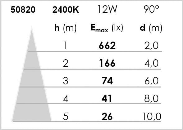 Conçu pour respecter l’arrêté 2018 relatif à la réduction des nuisances lumineuses - IP65, pour une résistance accrue en extérieur - Vitre en verre trempé IK08 - Capacité de résistance de 480H au brouillard salin - Efficacité : 1300lm pour 12W, soit plus de 100lm/W - Angle symétrique 90° - Durée de vie de 50'000 heures - Alimentation intégrée - Cable H05RN-F 3G 1mm2 en longueur 0.85m fourni ;
