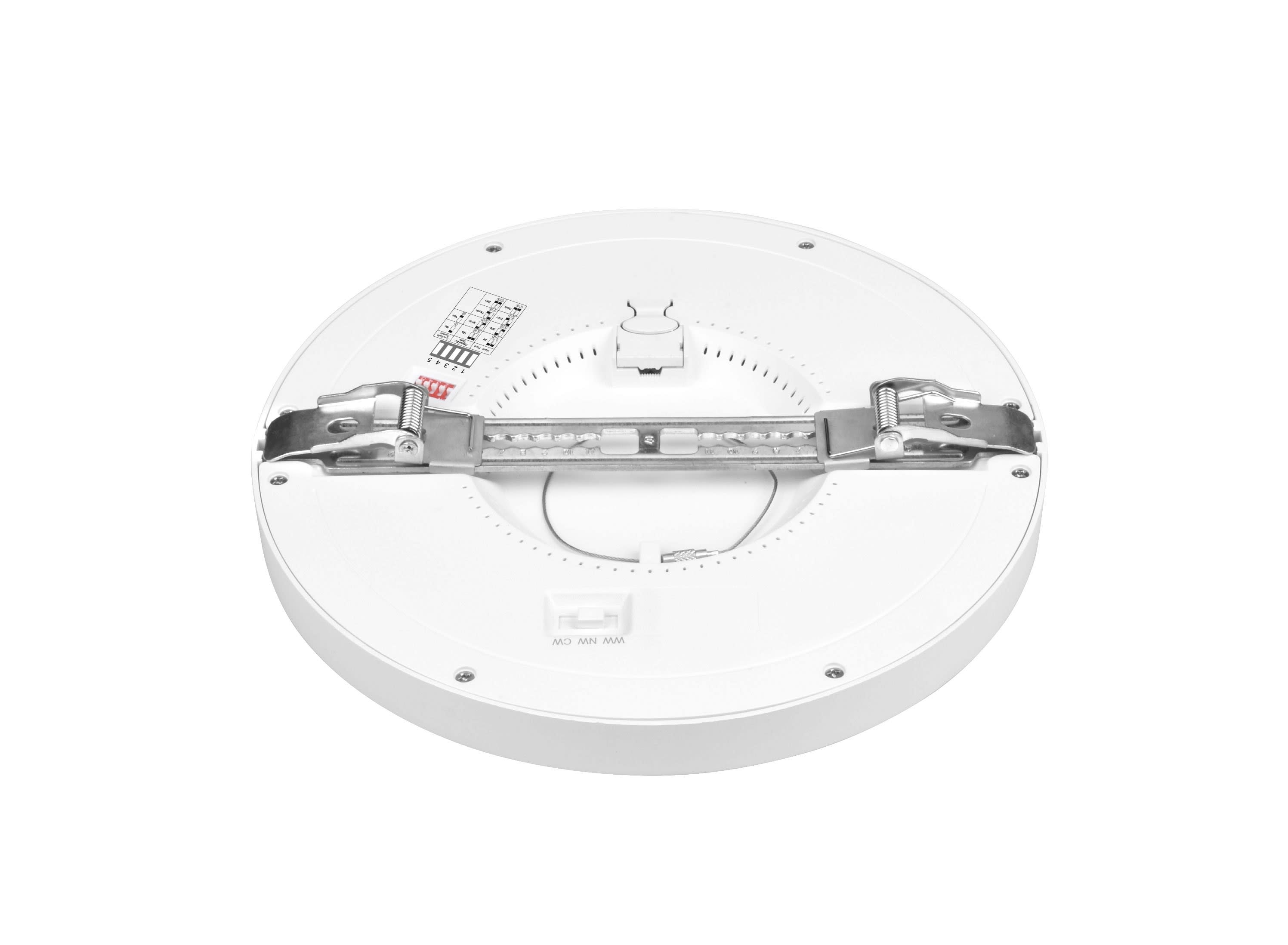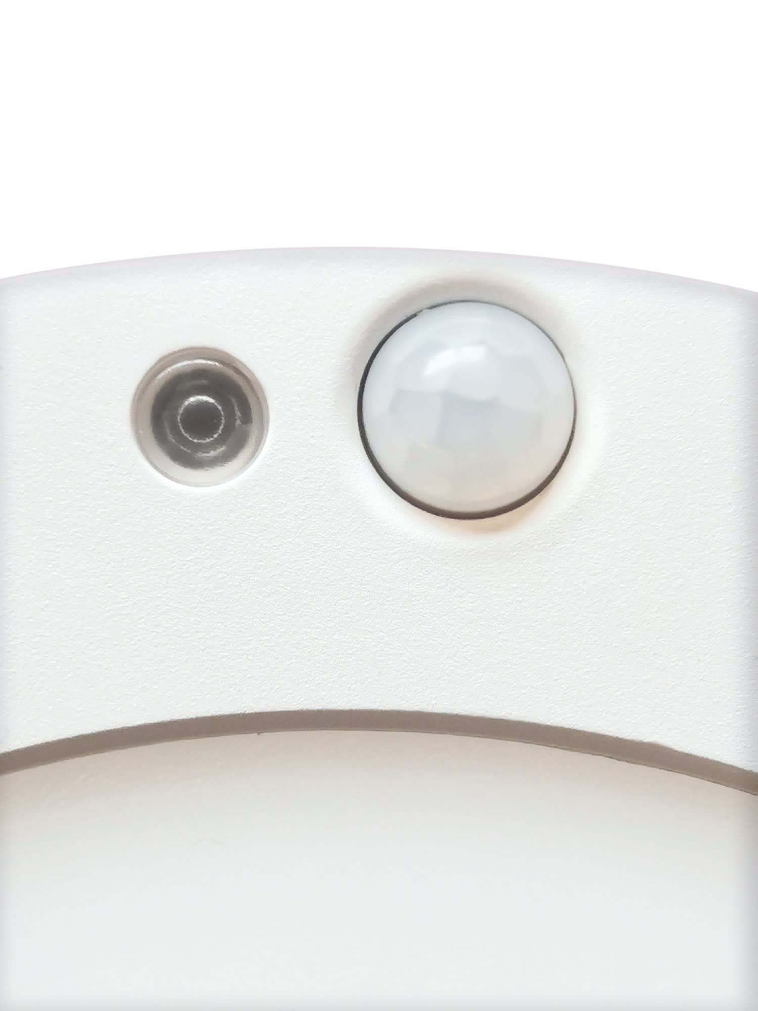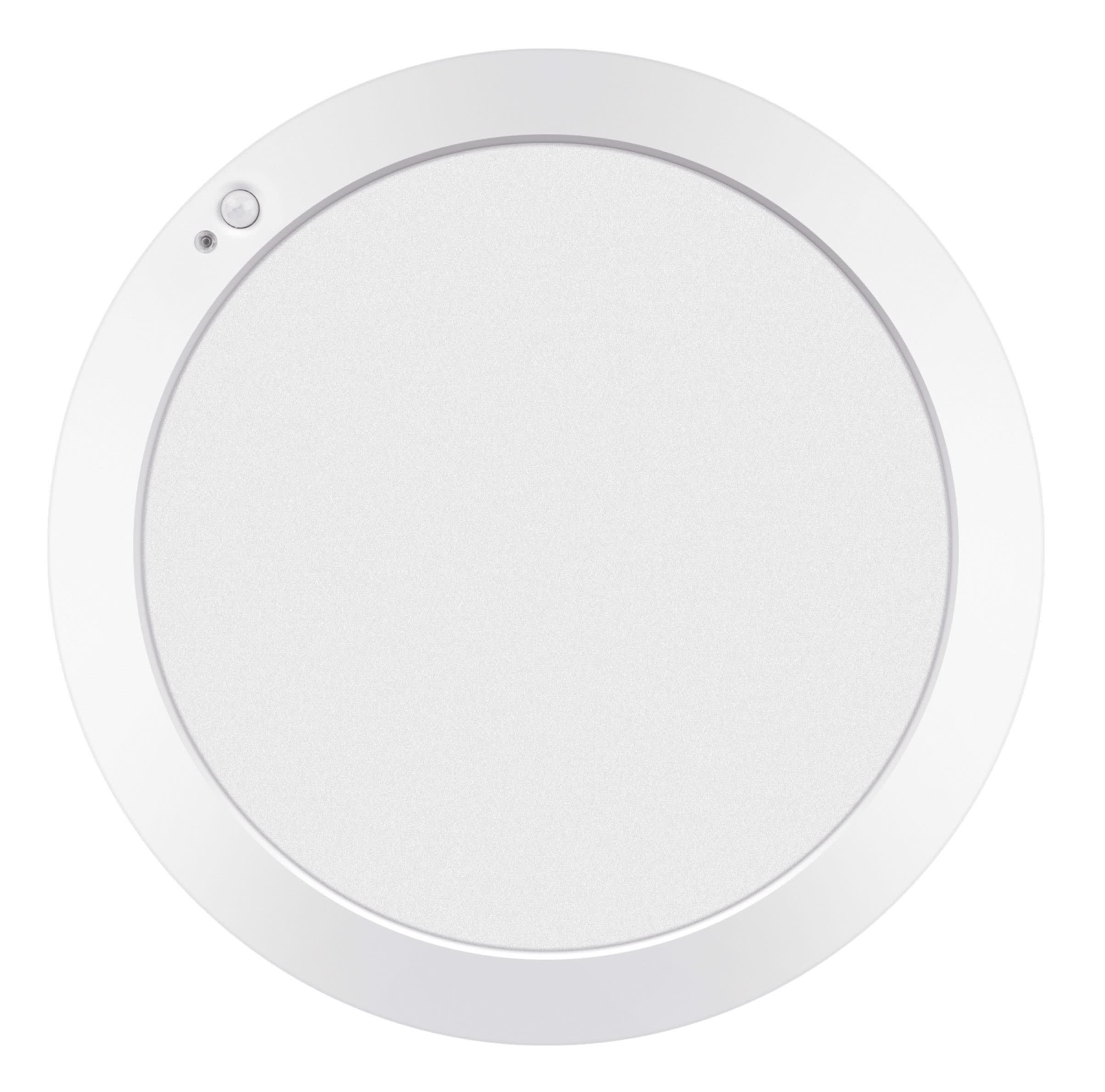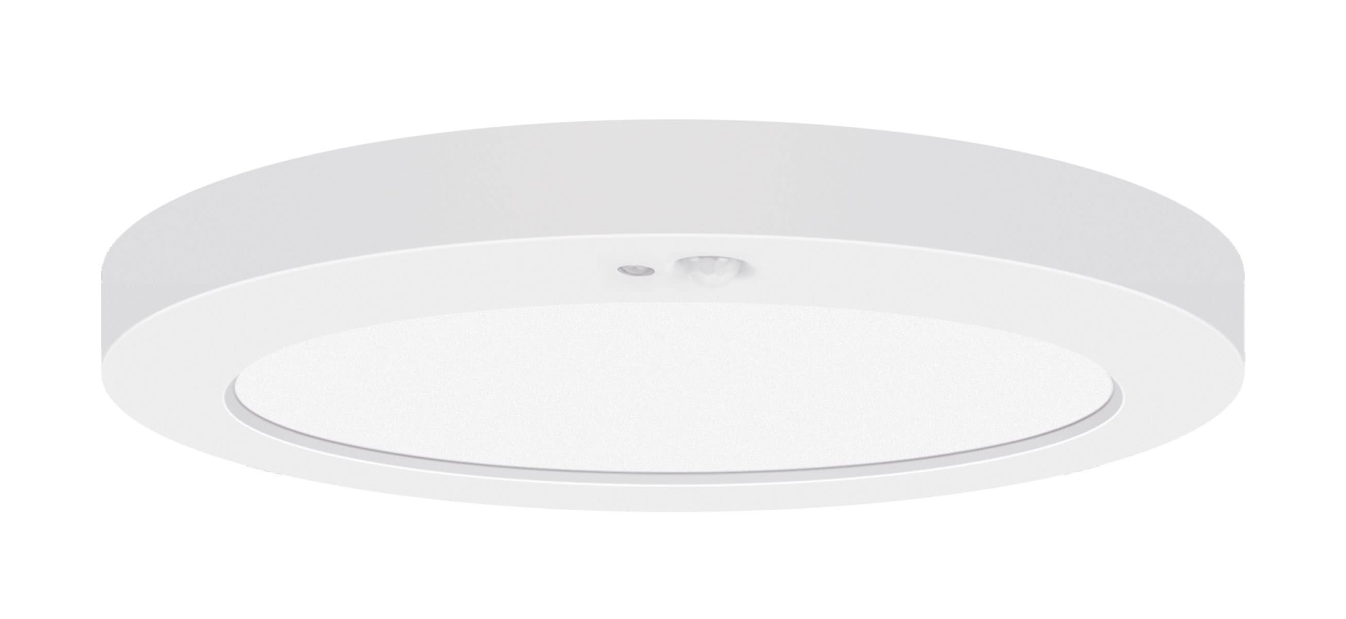 Spot encastré / Plafonnier à détection infra rouge UNIVERSAL SENSOR 12W Ø165mm, entraxe réglable : installation encastrée ou saillie, extra-plat, alim. intégrée, fixe, blanc, diffuseur PMMA. LED 110° 12W 30000h, 1050lm (en 4000K), température de couleur réglable (CCT 3000/4000/6000K). Variable (coupure de phase). Avec détecteur PIR.
