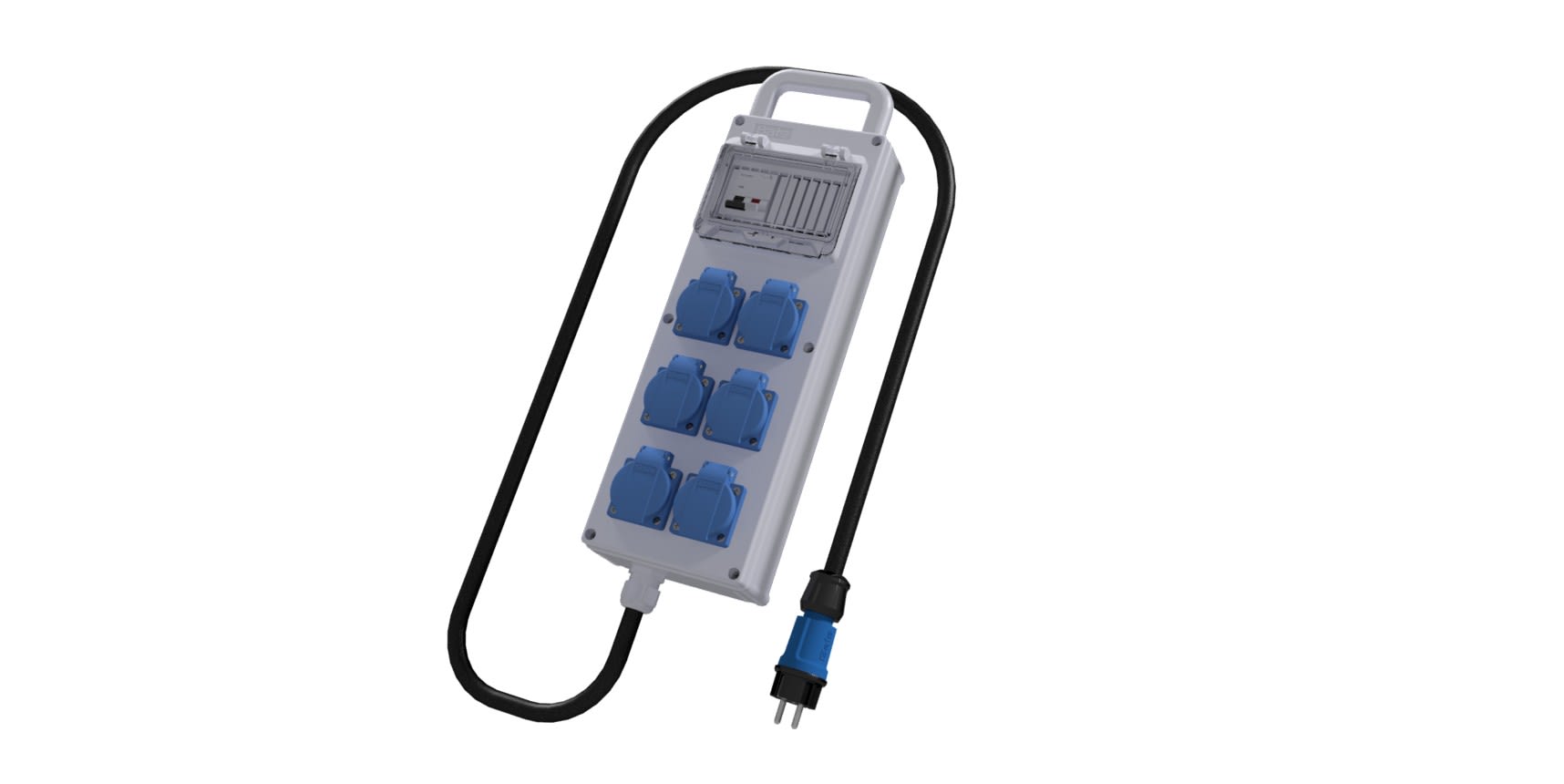 Coffret ABS avec poignée dim. 455x146mm équipé de :1 Disjoncteur Différentiel PH/N 16A 30mA1 Fiche 2P+T 10/16A 230V NF USE – NF C 613143M de câble H07RNF 3G2,5²6 PC 2P+T 10/16A 230V NF USE - NF C 61314