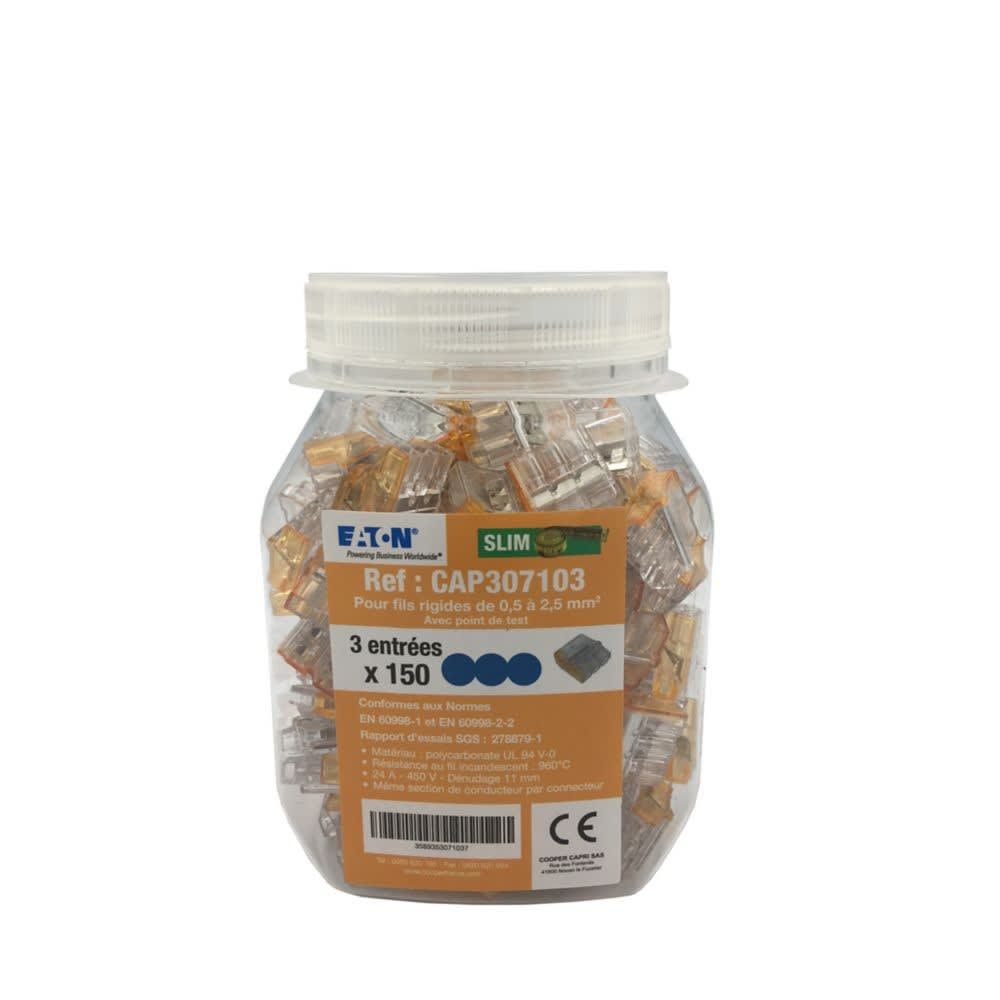 Cooper Capri - 150 Bornes de connexion SLIM 3 entrées pour fils rigides 0,5 à 2,5mm2 24A-450V - CAP307103