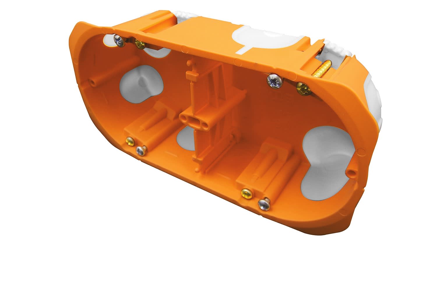 Boite BBC CAPRITHERM+ 2 poste 40mm Ø67mm, pattes multimatériaux pour fixation sur plâtre, béton, brique ou ciment, conforme aux réglementations thermiques RT 2012 et RT 2020, parfait pour les installations doubles.